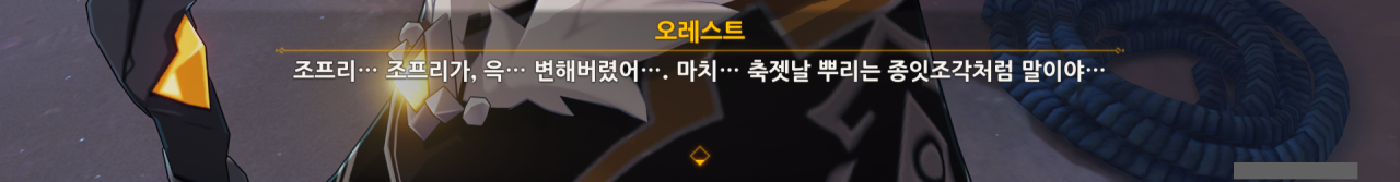 게다가 하필이면 그 조각난 조프리의 고깃 조각이 오레스트의 입에 날아 들어간 모양이다. 오레스트는 무의식적으로 그걸 퉤 하며 뱉어냈지만, 방금 자신의 입에 들어온 게 사람의 고깃 조각이란 걸 금세 깨달았다.