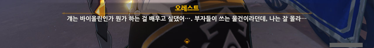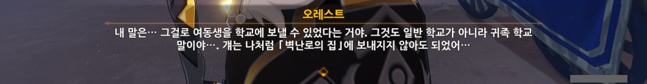 자신과 마찬가지로 고아가 된 자신의 여동생이 바이올린을 배우고 싶어 하자, 여동생을 자신처럼 「벽난로의 집」이 아닌 귀족 학교에 보내기 위해 우인단에 들어왔다고 한다. 우인단에 들어가면 엄청난 양의 모라를 무려 비과세로 지급해 주니까.