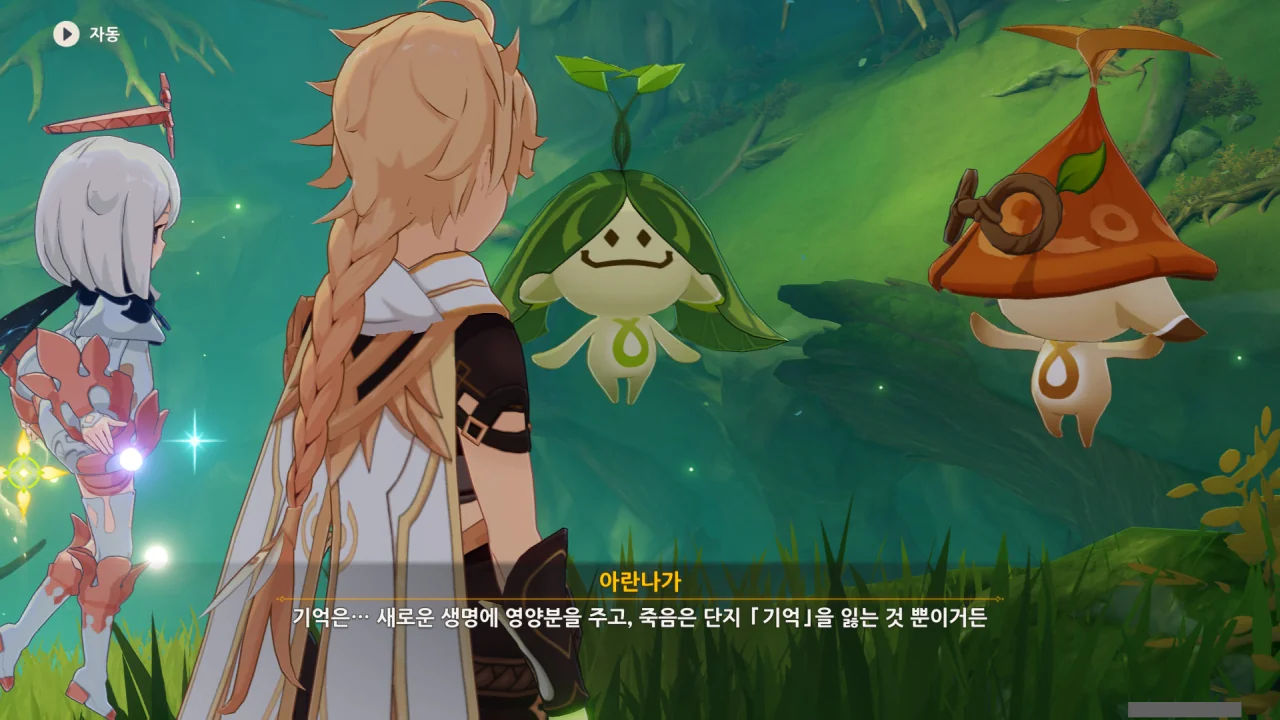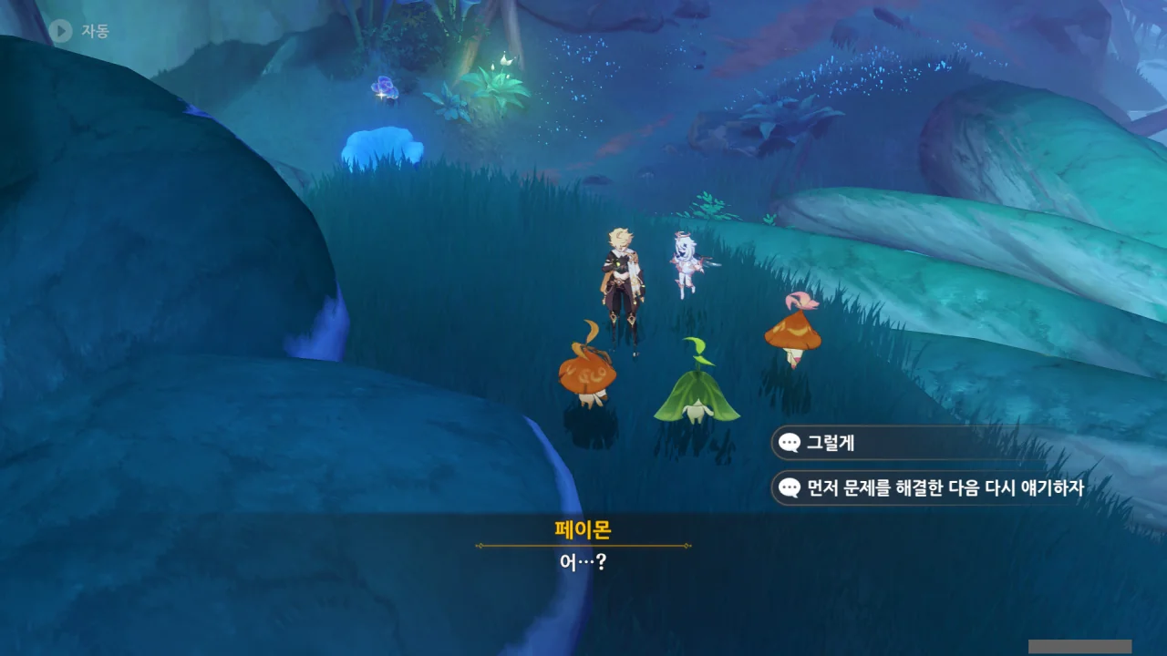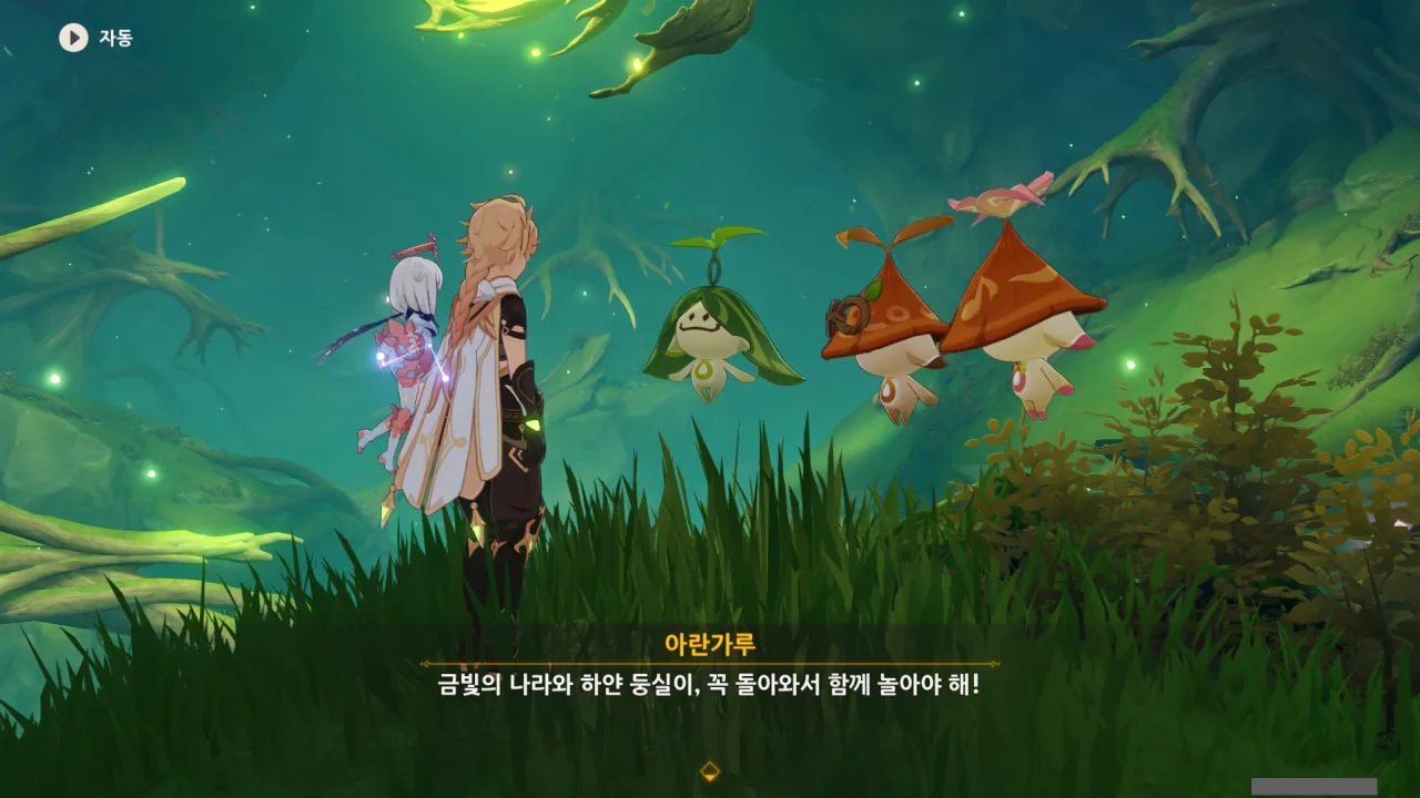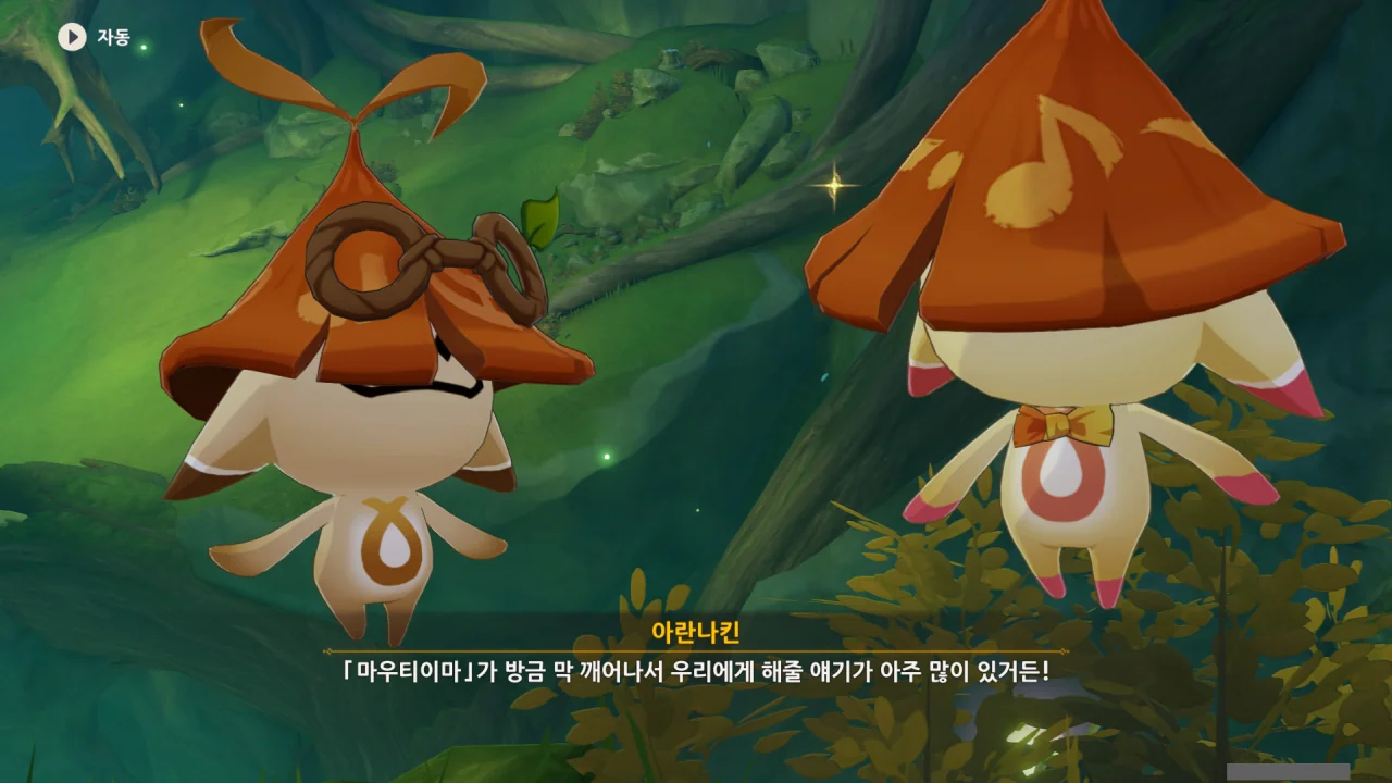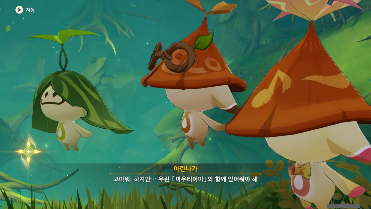 밖으로 나가 햇볕을 쬐면 머리가 맑아질 거라는 페이몬의 말에, 「마우티이마」와 함께 있어 줘야 한다며 거절하는 아란나라들.