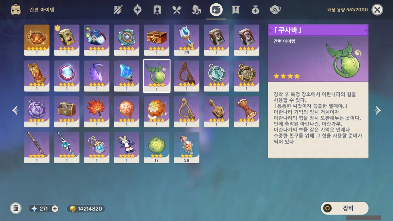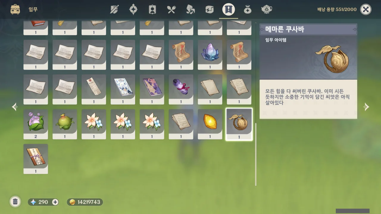 아, 「쿠사바」는 아무래도 이번 월드 임무 전용 아이템이었나보다. 모든 힘을 다 써서 메말라 버렸다고 되어 있다.