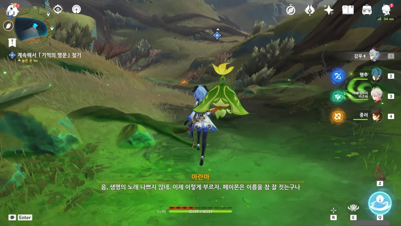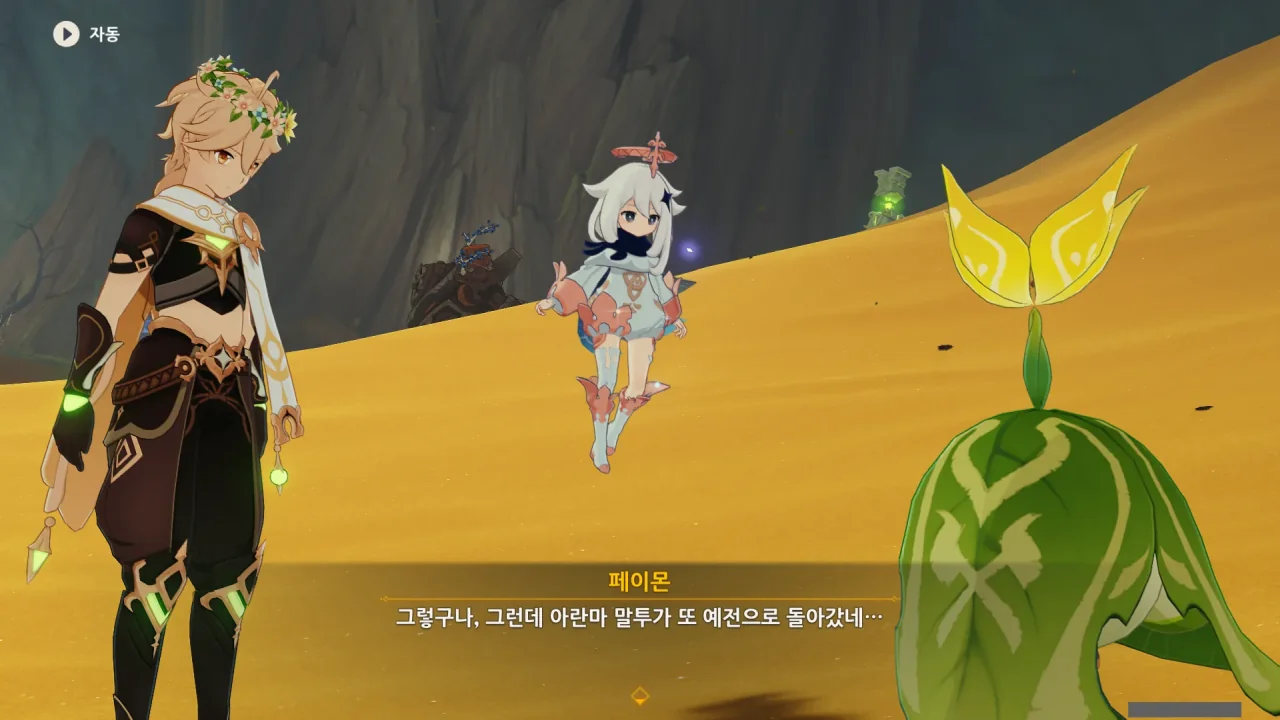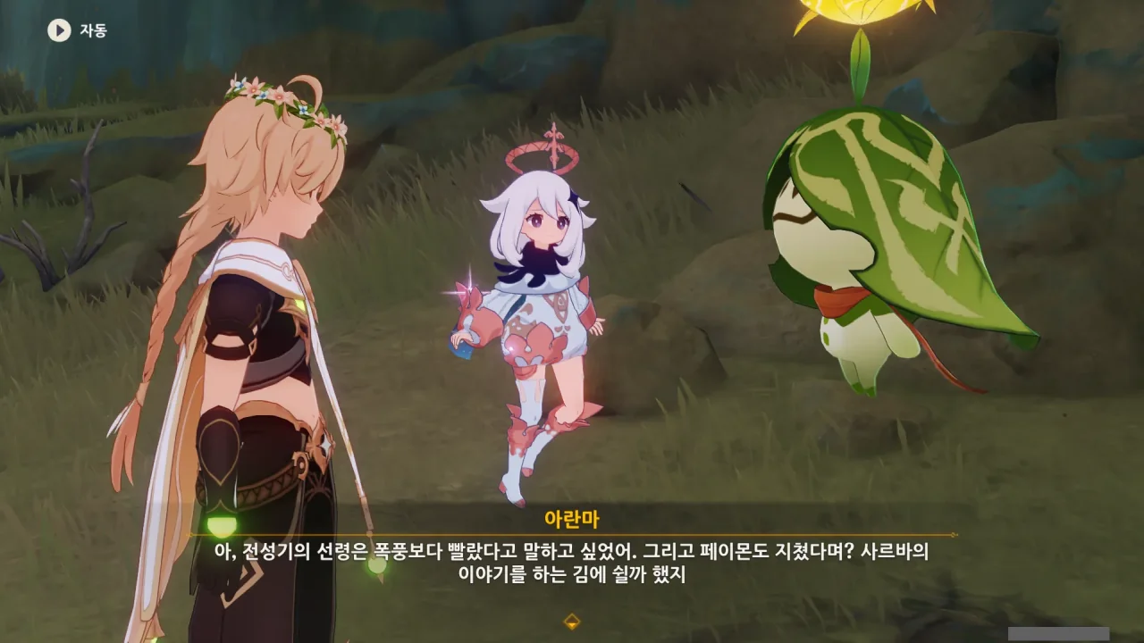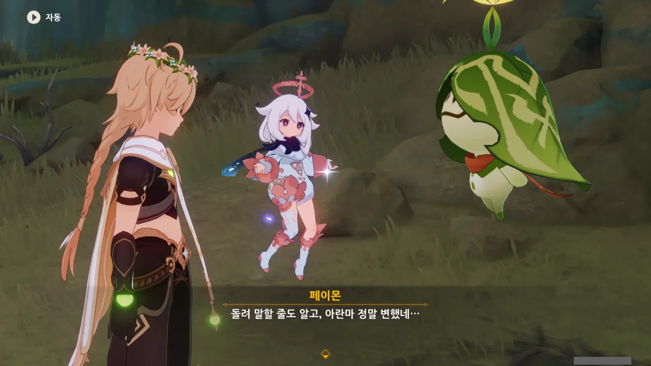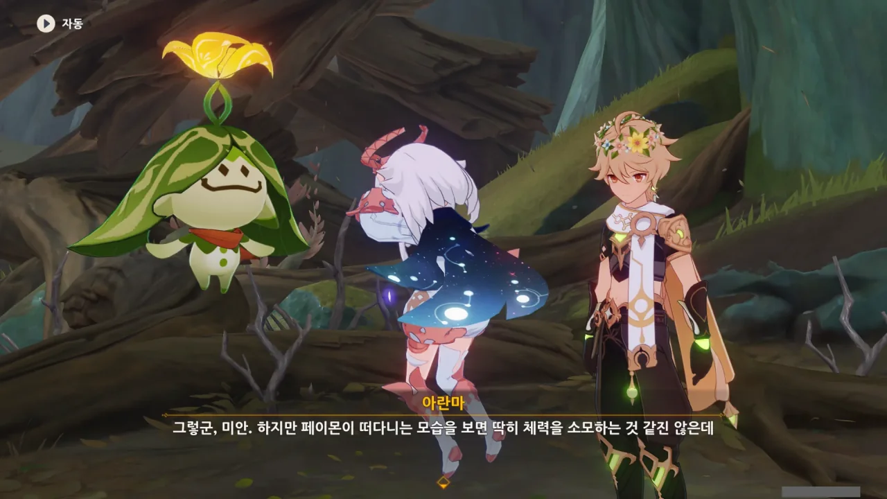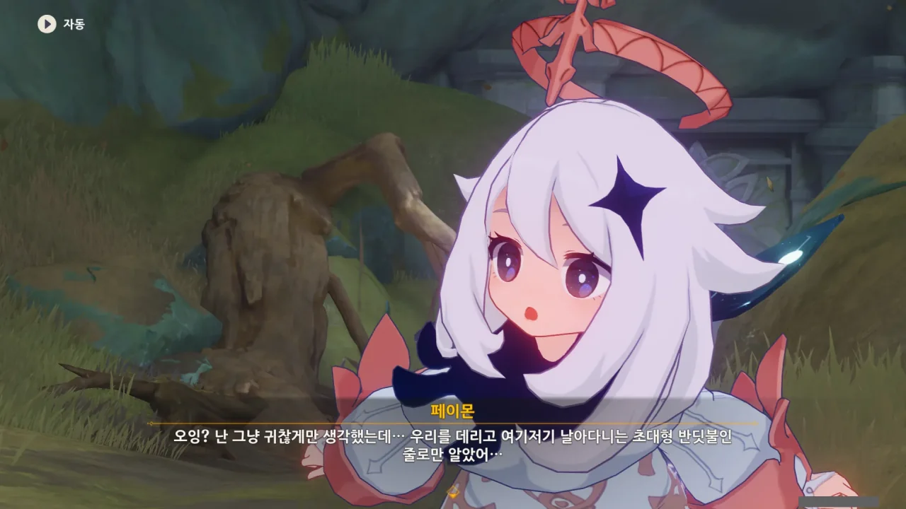페이몬이 좀 천천히 가달라고 말하자, '페이몬이 떠다니는 모습을 보면 딱히 체력을 소모하는 것 같진 않은데'라고 답하는 아란마. 그래, 나도 계속 그 생각을 하고 있었거든.