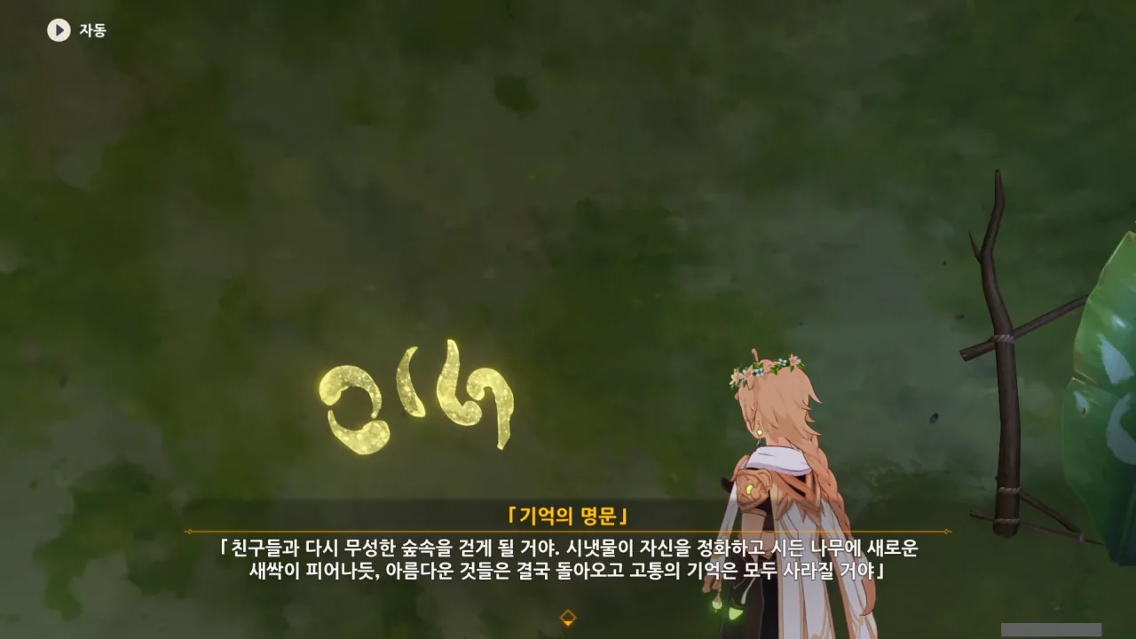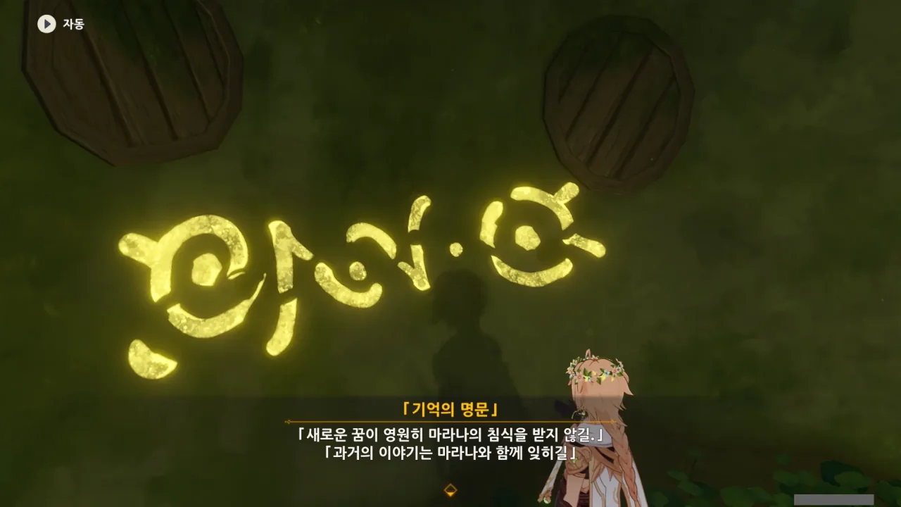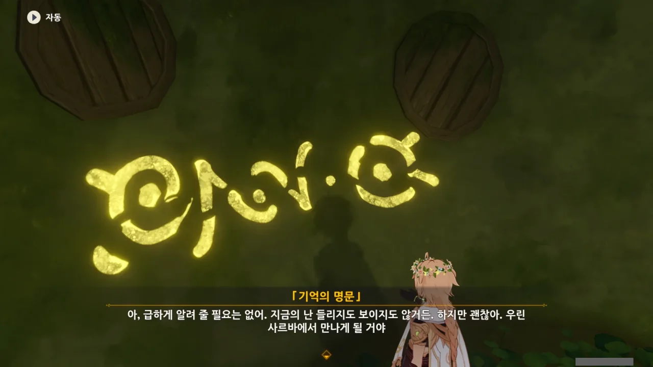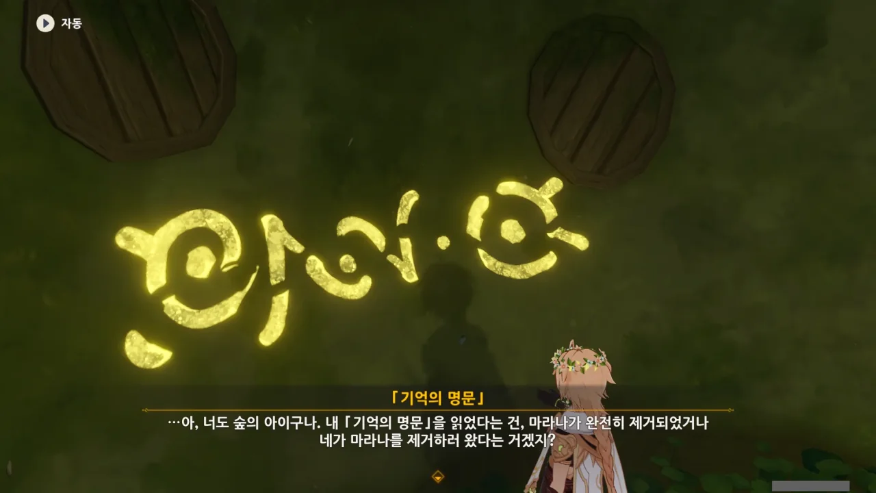 … 아, 너도 숲의 아이구나. 내 「기억의 명문」을 읽었다는 건, 마라나가 완전히 제거되었거나 네가 마라나를 제거하러 왔다는 거겠지?