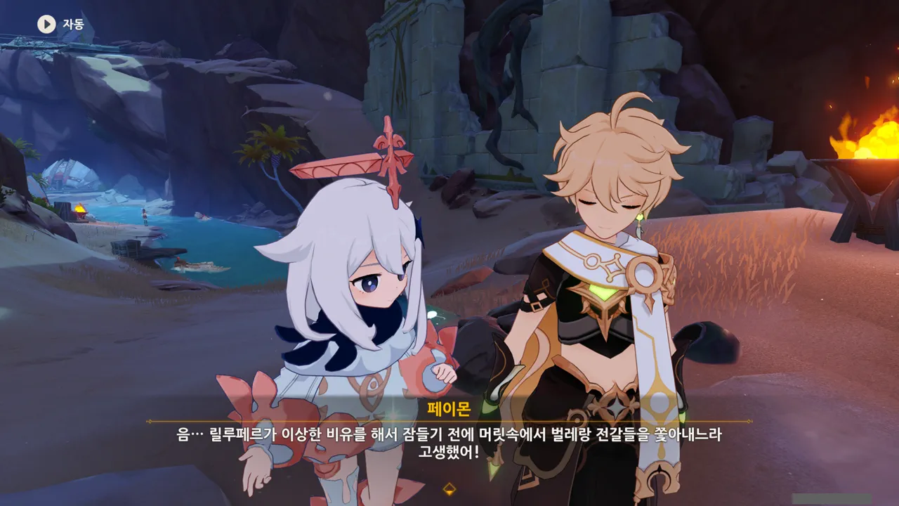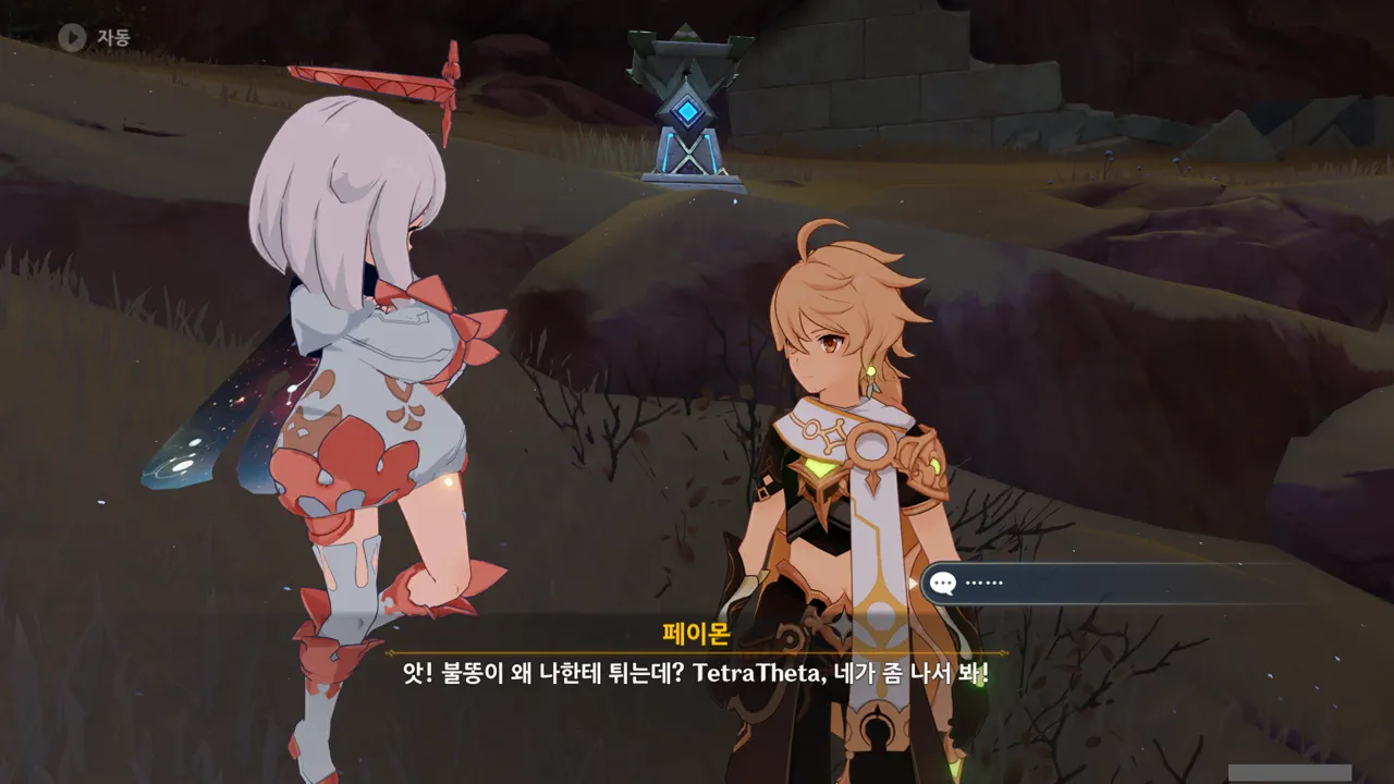 페이몬은 이렇게 말로 얻어맞는 걸 보는 게 제일 재미있다니까. 불똥이 왜 튀기는! 먼저 이니시를 걸었으니까 불똥이 튀기지!