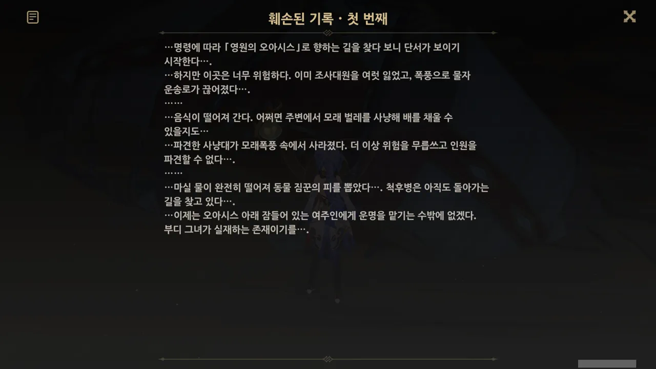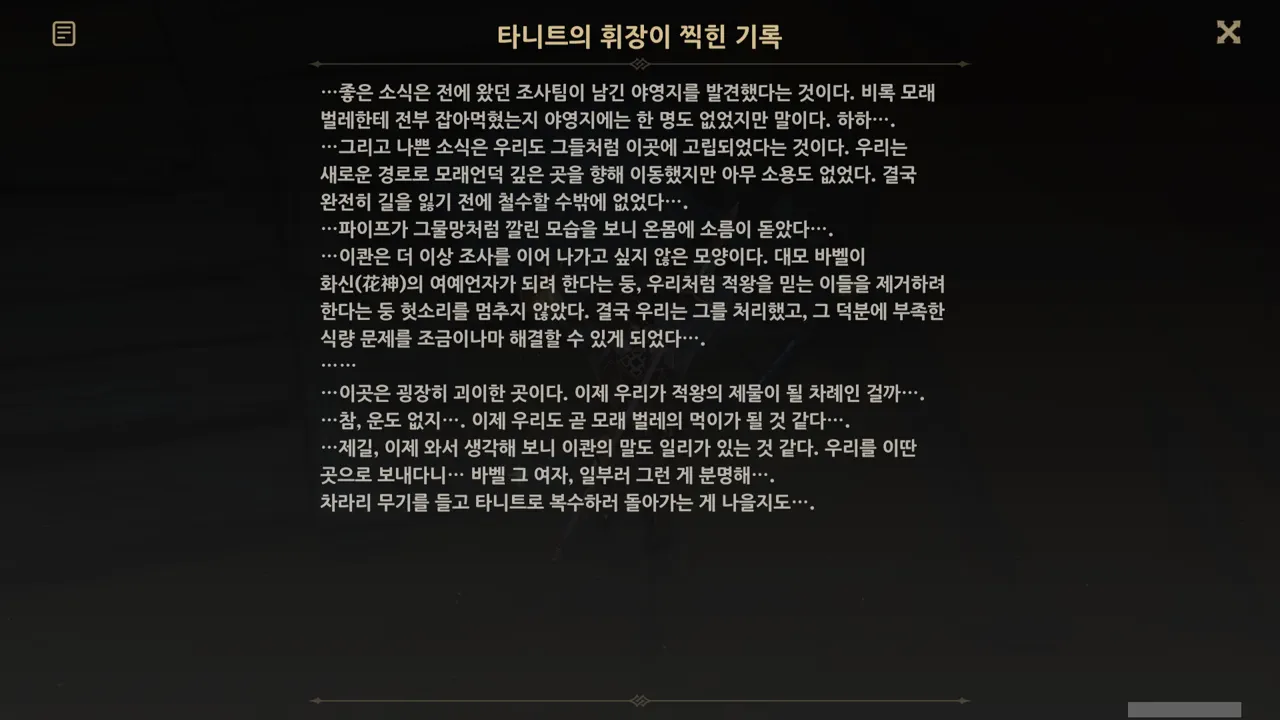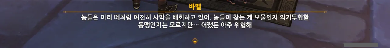 오아시스 수로에 릴루페르의 다른 조각이 있다고? 그걸 바벨은 대체 어떻게 알아낸 거야? 적어도 이 야영지에서 볼 수 있는 책에는 그런 언급이 없었던 거 같은데.