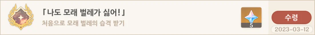 그렇게 생각한 순간, 바닥에 붉은 원이 표시되더니 바닥에서 드릴이 솟아올라왔다. 그리고 그와 동시에 '나도 모래 벌레가 싫어!'라는 업적이 달성되었다.