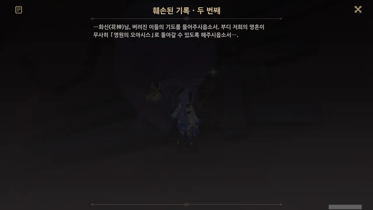 그 야영지에 꽃의 화신과 '영원의 오아시스'를 찾는 문서가 하나 남겨져 있다.