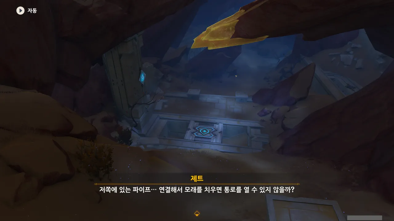 지금 저기 있는 파이프는 안에 모래가 있다는 뜻으로 빛나고 있는데, 정작 연결된 곳에는 모래 그릇도 없고, 그저 돌밖에 없다. 대체 어디로 연결된 걸까?