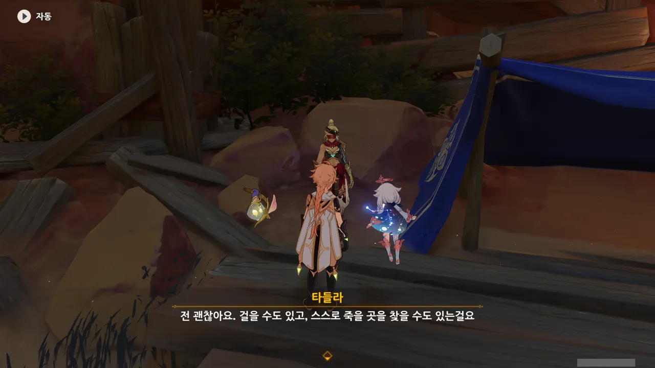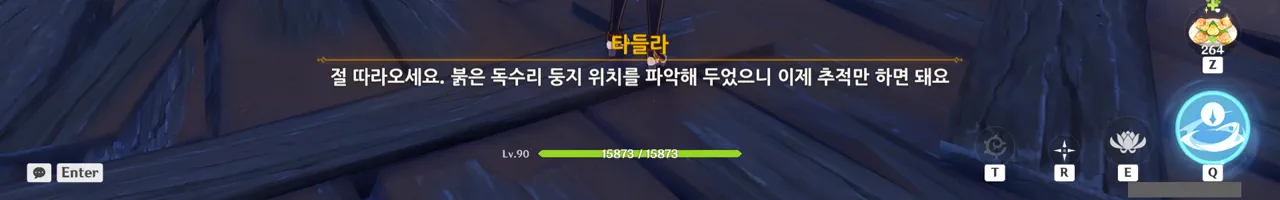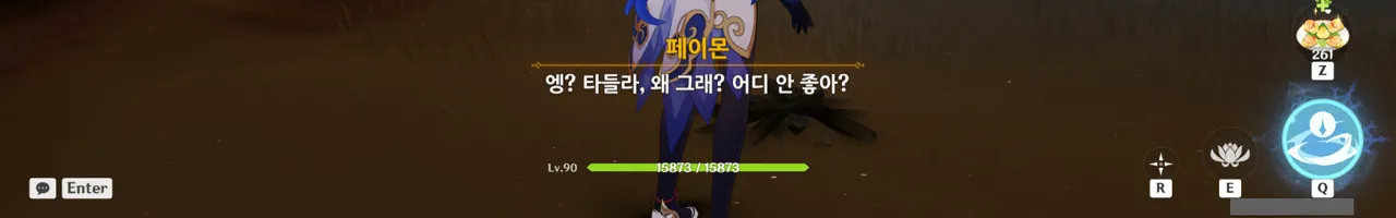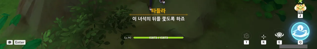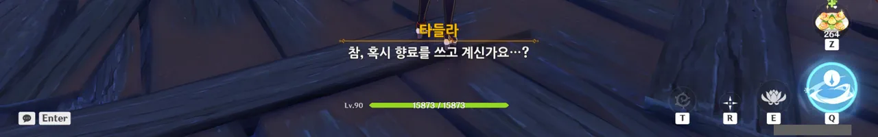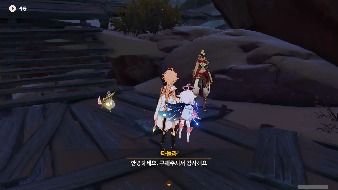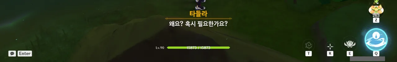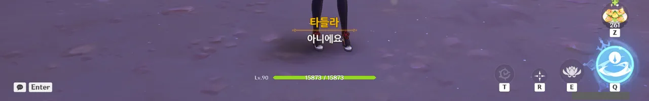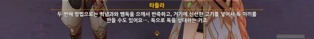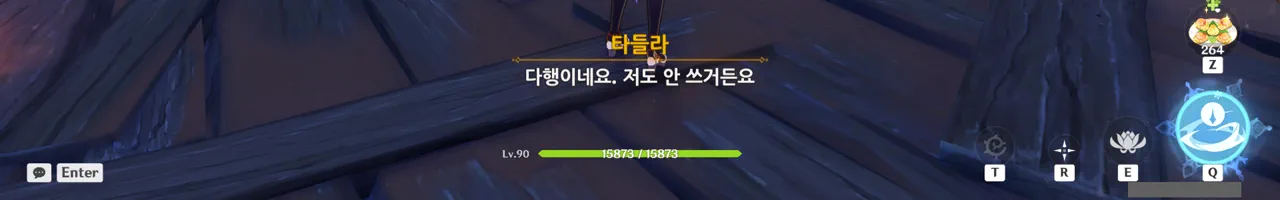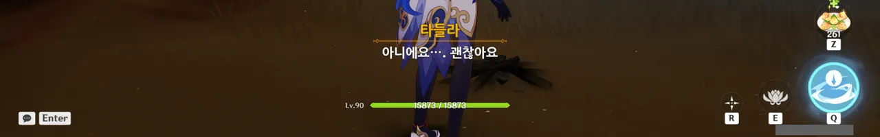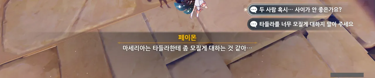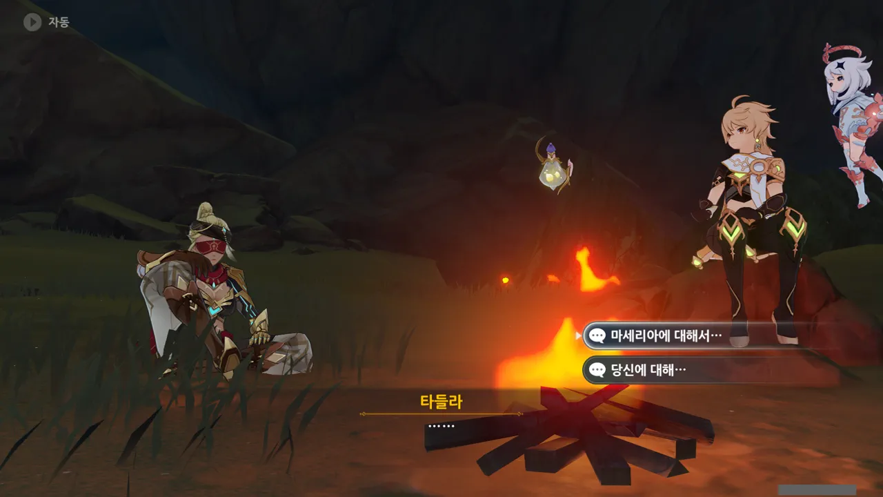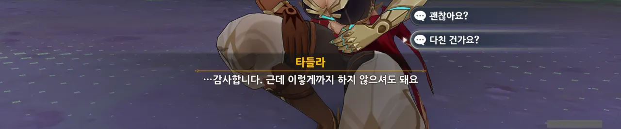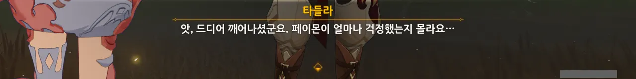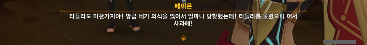흠… 아까 우인단과 전투할 때, 우연히 타들라가 나히다의 E 스킬 범위 안에 들어가, 타들라의 속마음을 볼 수 있었다.