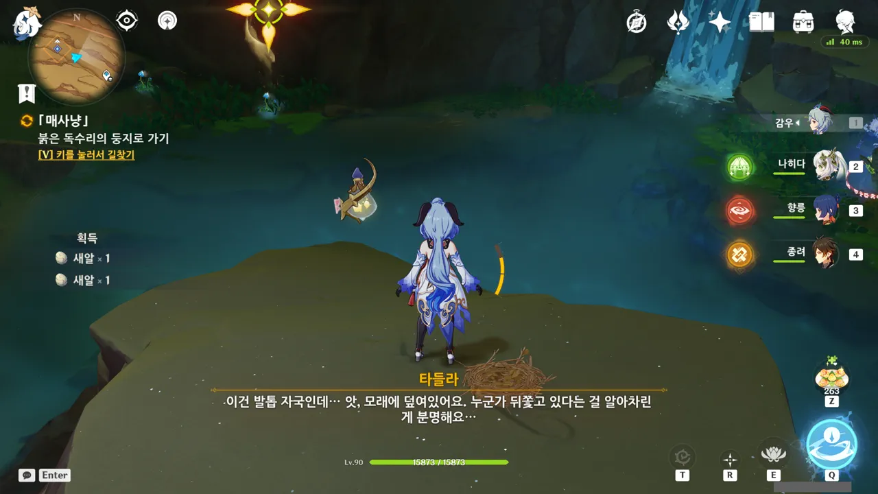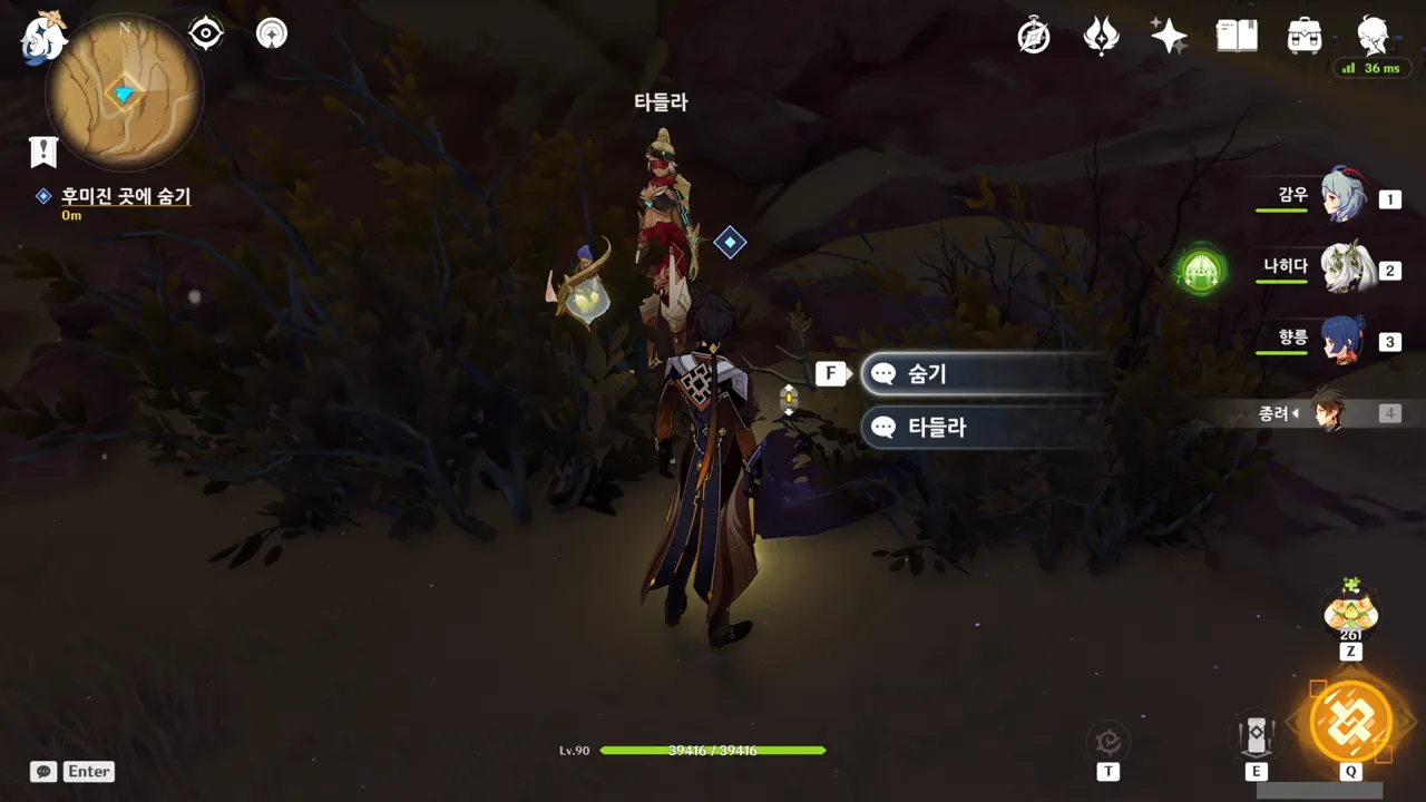 임무 내용에 '후미진 곳에 숨기'라고 되어 있길래 대체 어디에 숨어야 할까 생각했는데, 뒤편에 타들라와 함께 조사 포인트가 하나 있었고, 조사 포인트를 들여다보니 '숨기'라고 적혀있었다.