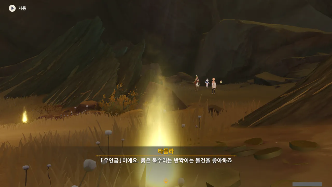 하지만 그전에 일단 페이몬의 말처럼 반짝이는 것을 먼저 좀 조사할 생각이다. 저 조사 포인트를 만졌을 때 어떤 대화나 반응이 나올지가 매우 궁금하거든.