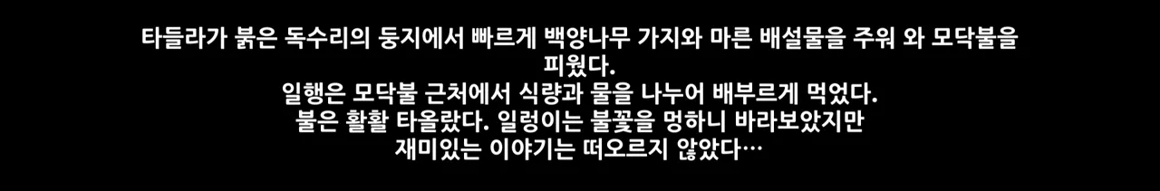 아자릭과 제트와 함께 모닥불 앞에 앉았을 때에는 아자릭이 이런저런 이야기를 해서 분위기가 참 부드러웠는데… 지금은 그때와는 또 분위기가 다르다.