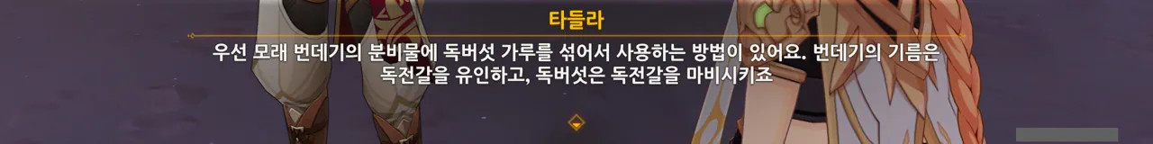 그런데 침식 디버프는 수계 늑대 시리즈처럼 심연 계열의 몹만 쓴다. 그러니 독전갈이 심연과 관련이 없는 한, 독전갈은 침식 디버프를 걸지 않을 것이다.