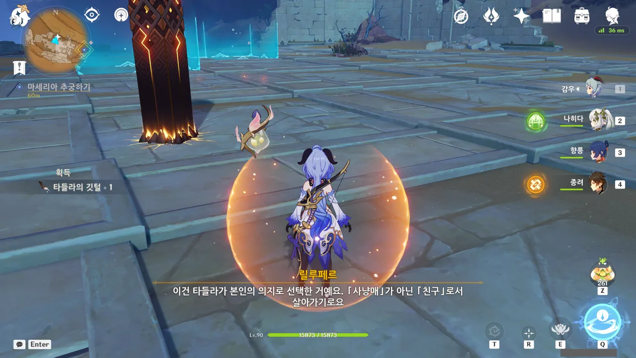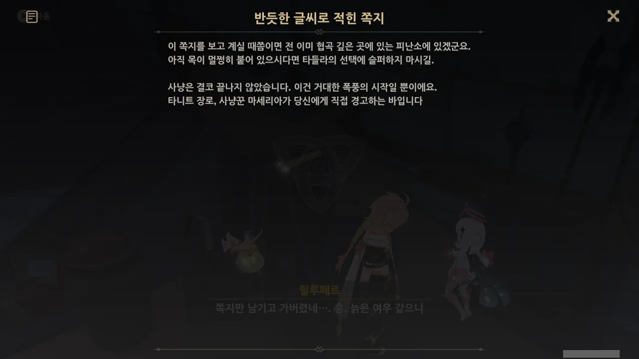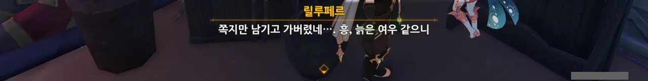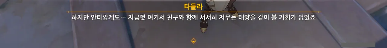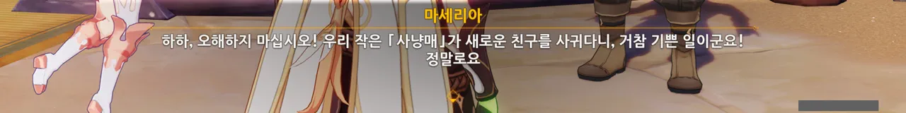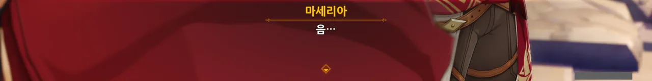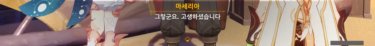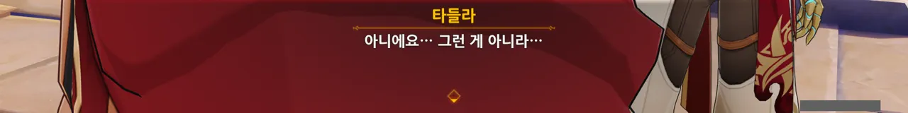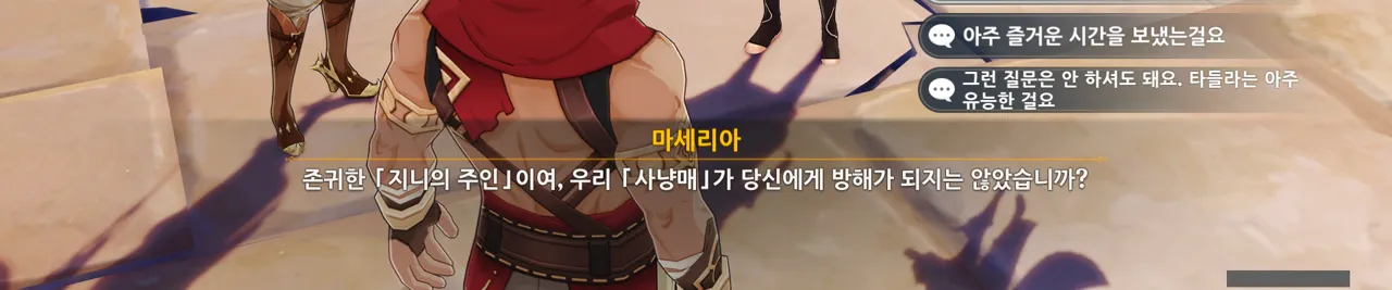 평소 타들라에 대한 마세리아의 태도를 볼 때, 저건 정말 타들라가 무사해서 다행이라고 말하는 게 아니라, 지니의 주인인 여행자에게 잘 보이기 위해 하는 빈말로 보인다.