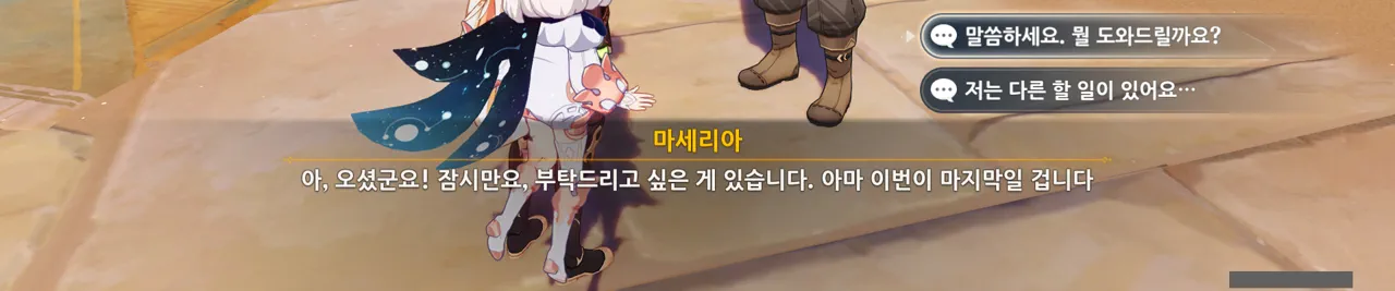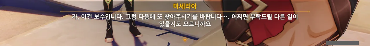 마세리아도 여행자와 타들라 사이의 관계를 눈치챈 듯, 여행자에게 타들라와 멀어지라고 이야기한다.