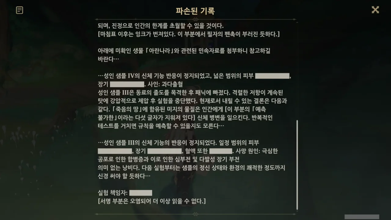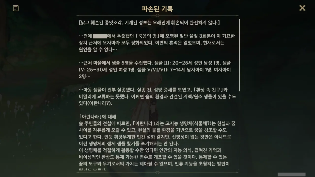 층암거연까지 간 아란님바는 검은색 오염을 만나 위험에 빠졌고, 위기에서 벗어나기 위해 씨앗으로 변했다고 한다. 그걸 여행자가 주워서 수메르까지 온 것이고.