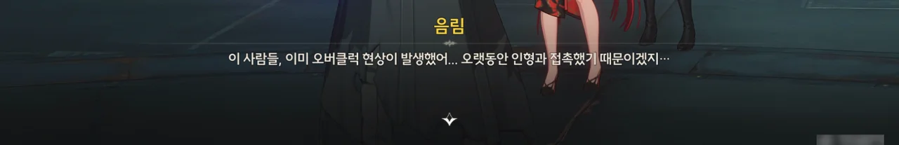 언사의 부하로 보이는 추방자가 가족을 돌려달라며 다짜고짜 음림을 공격한다. 가뜩이나 인형에 오래 노출되어 정신이 불안정해진 상태에서, 순찰관과 잔상의 침입 때문에 정신이 무너져내려 오버클럭에 빠진 것이다.