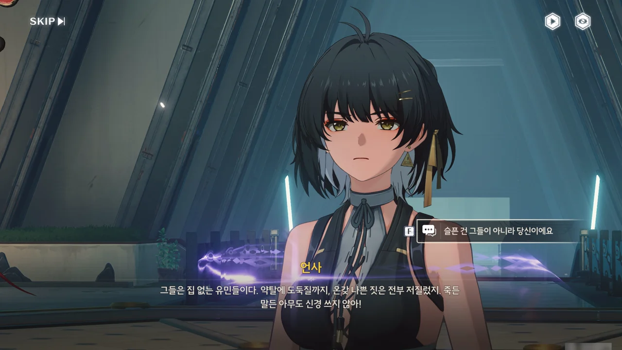 여기까지 오며 마주친 추방자에게 오버클럭 증세가 나타나 죽일 수밖에 없었다고 음림이 말하자, 그들은 어차피 버려질 운명이었으며, 온갖 나쁜 짓을 저지른 집 없는 유민이니 죽든 말든 아무도 신경 쓰지 않는다고 언사가 차갑게 말한다.