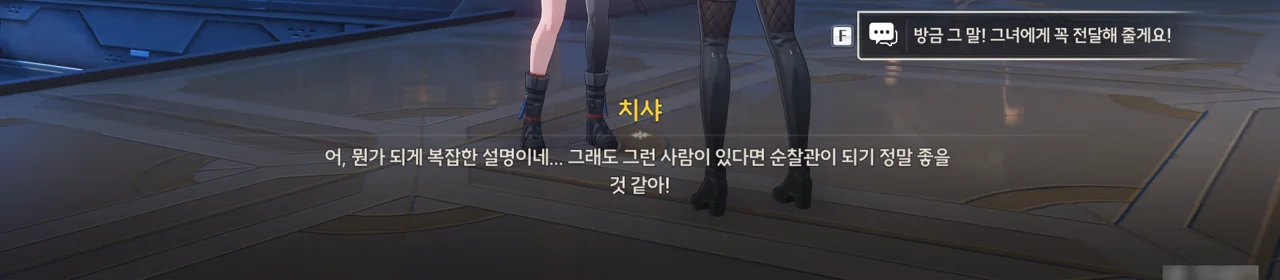 방랑자가 '어둠 속에 숨은 정의의 사도", '정과 의리를 중시하는 동반자", '적인지 아닌지 구분하기 어려운 사람'에게 도움을 받았다고 말하자, 그런 사람이 있다면 순찰관이 되기 정말 좋은 사람일 것 같다고 치샤가 말한다.