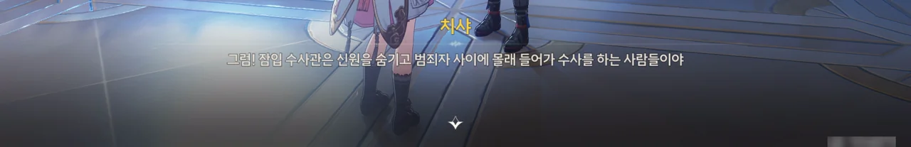 출발하기 전, 치샤에게 잠입 수사관에 대해 묻자, 잠입 수사관에 대해 간략히 설명해 주며, 자신이라면 3분도 안 되어 들통날 거라고 답한다.