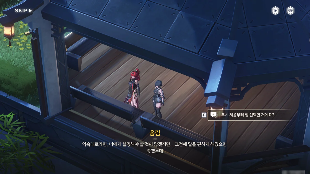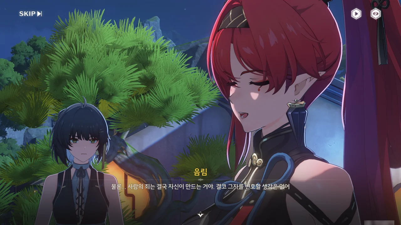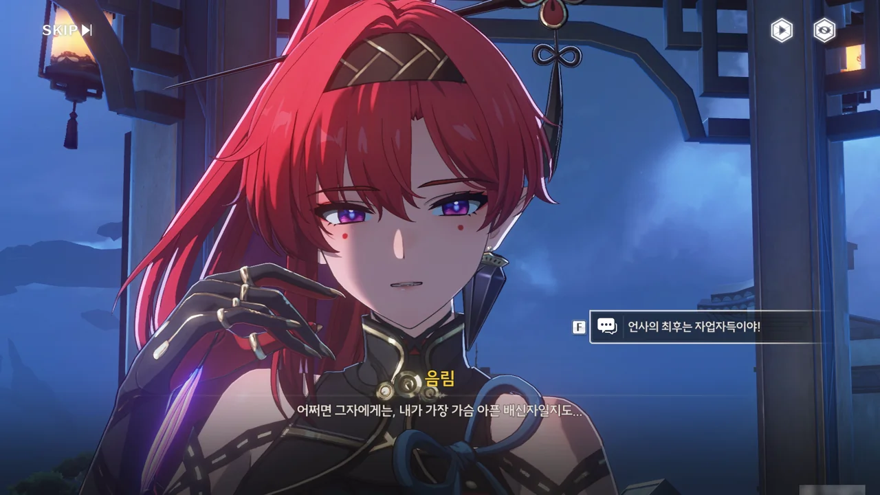 잔성회와의 악연이 조금 질긴 방랑자가 여기서 발을 뺄리는 없고, 그래서 장난스레 "자비를 베풀어주십시오 아가씨!"라고 대답한다. 방랑자가 장난치는 걸 눈치챈 음림 역시 진심으로 방랑자를 위협하진 않았다.