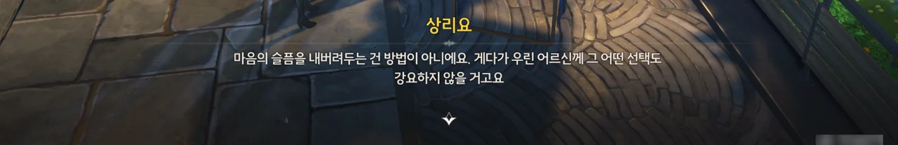 방랑자가 가족과 이별하여 고통을 겪고 있는 사람에게 잠깐 나서는 것만으로 과연 충분할지 걱정하자, 상리요가 그렇다고 이렇게 마음의 슬픔을 내버려 두는 것은 좋은 방법이 아니라고 말한다.