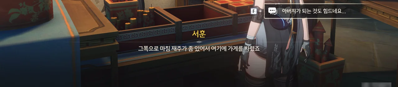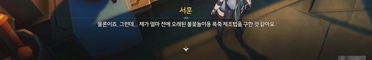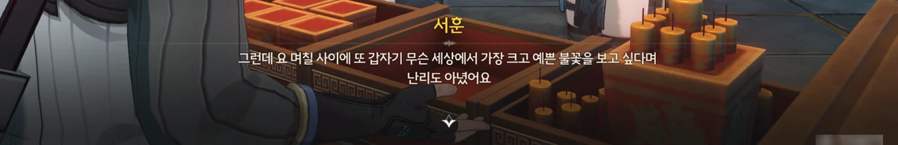 서훈의 딸은 '가장 크고 예쁜 불꽃'을 보고 싶어 했지만, 서훈이 파는 폭죽은 그녀의 마음에 들지 않았다고 한다. 그러던 와중, 오래된 불꽃놀이용 폭죽 제조법을 구한 서훈은 제조법에 드는 재료가 몹시 희귀하고 희한하니 분명 그 모습도 대단할 거라 생각해 한 번 그 폭죽을 만들어보려 한다. 재료 중 굉명 유황 결정은 구했지만 나머지 두 재료를 구할 수 없어 방랑자에게 대신 재료를 구해다 줄 것을 부탁한다.