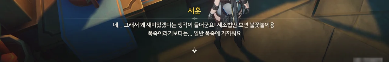 비록 서훈이 원하던 폭죽은 아니지만, 무무물류 택배원이 이걸 가지고 다니다 잔상을 만났을 때 써먹으면 나름 괜찮을 거다. 이걸로 잔상을 처치하지는 못하겠지만, 잔상을 잠시 주춤하게는 만들 수 있겠지.