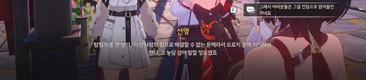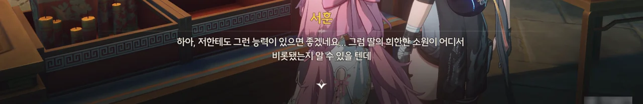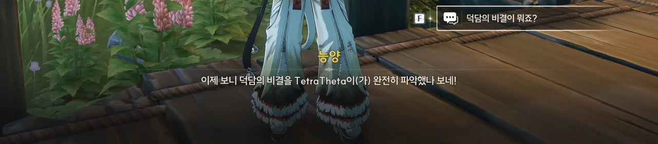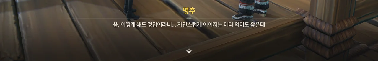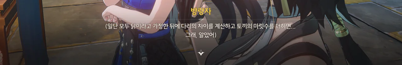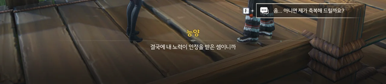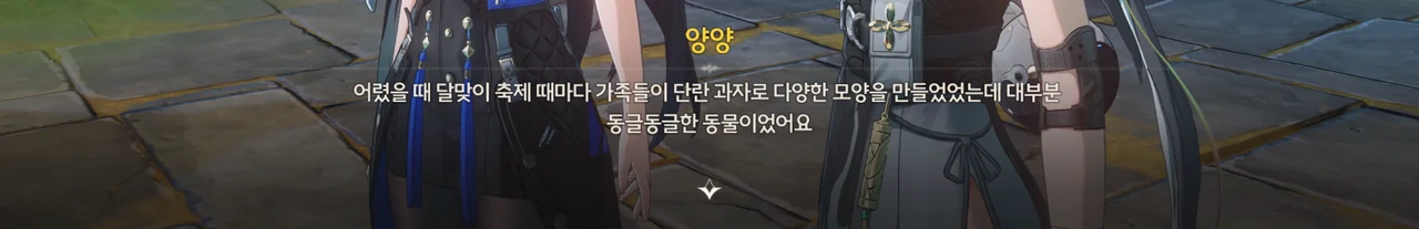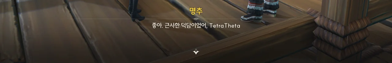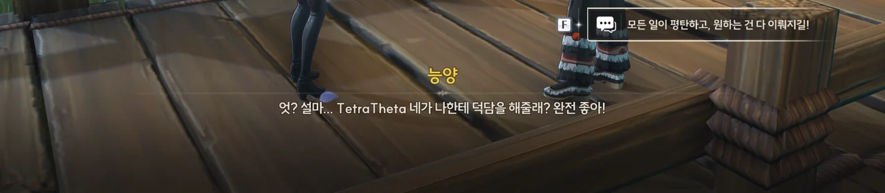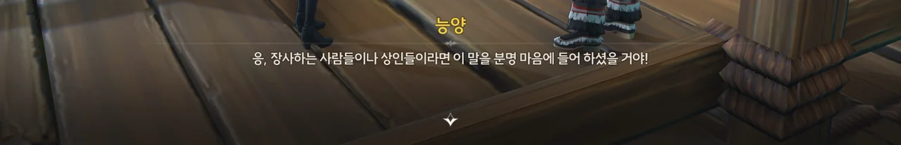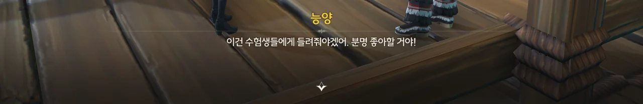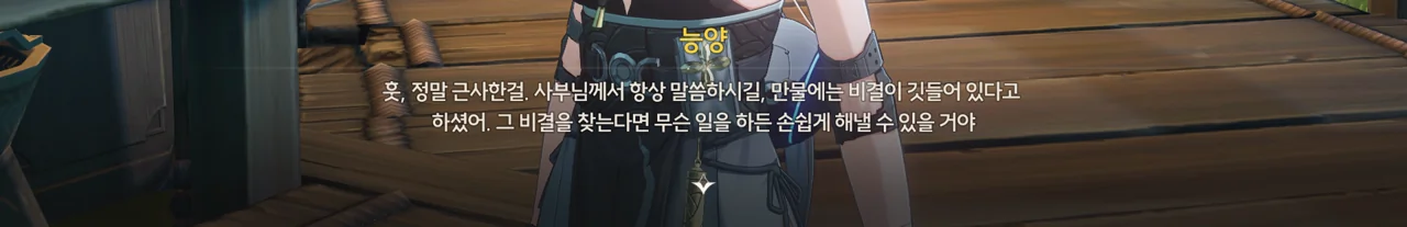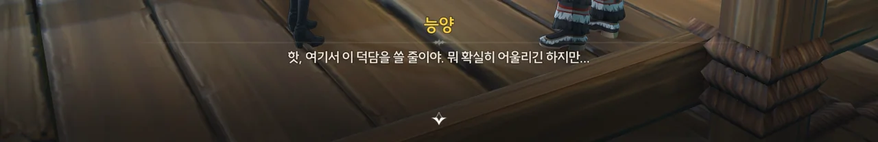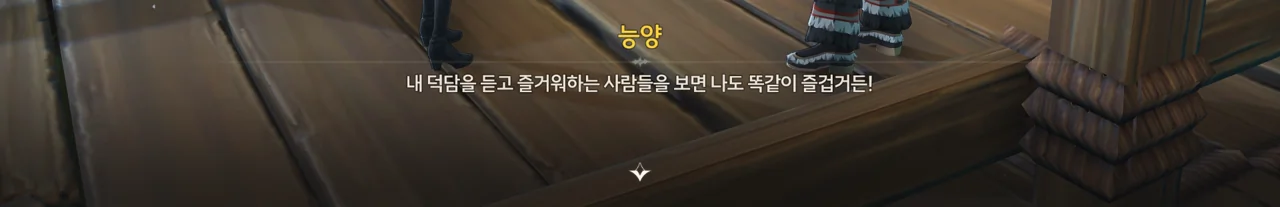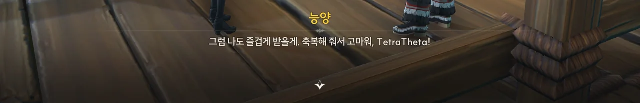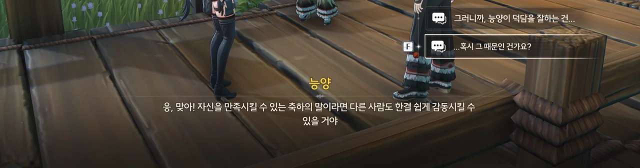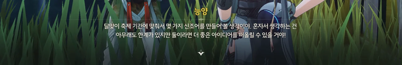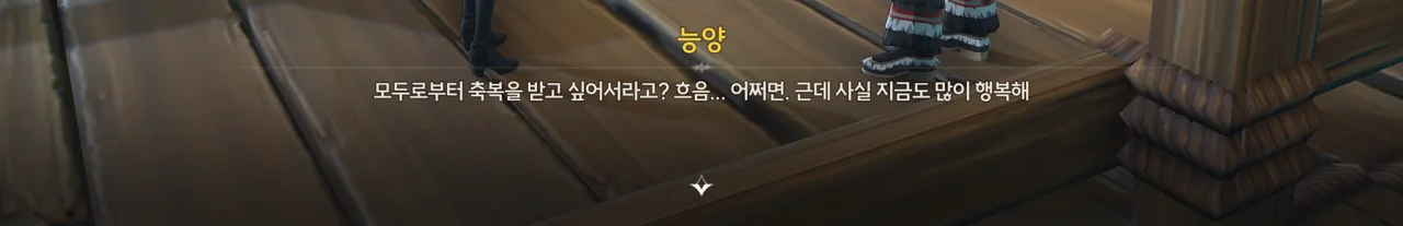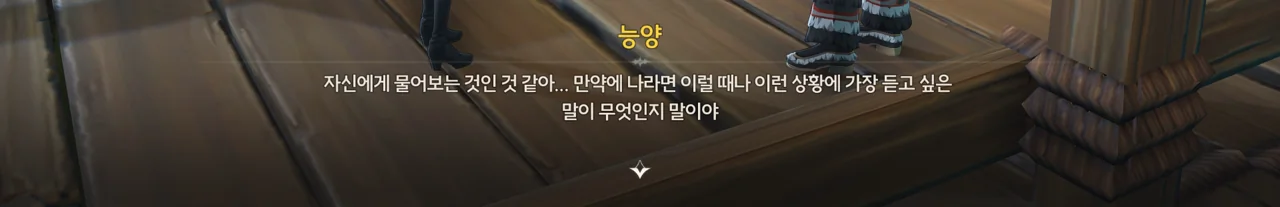 능양이 생각하는 덕담의 비결은 상대방의 상황에 자신이 처했을 때 가장 듣고 싶을 말을 전해주는 것이라 한다. 그 말대로라면, 능양이 덕담을 잘하는 건 자신 역시 여러 사람들로부터 축복을 받고 싶어서인 걸까? 본인은 지금도 많이 행복하다고는 하지만, 내가 보기에 남들에게 쉬이 말할 수 없는 외로움은 분명 있을 것 같거든. 능양 얽힌 별 임무에서 보았듯이, 능양은 한 종족의 마지막 생존자이니까.