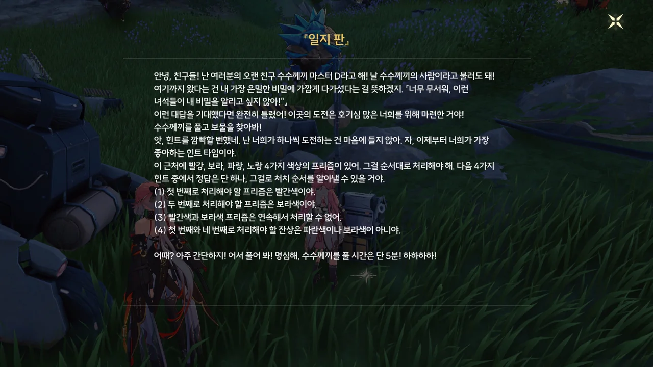 빨강, 보라, 파랑, 노랑 네 가지 색상의 프리즘을 순서대로 처리해야 하는 전형적인 비밀번호 퍼즐이다.