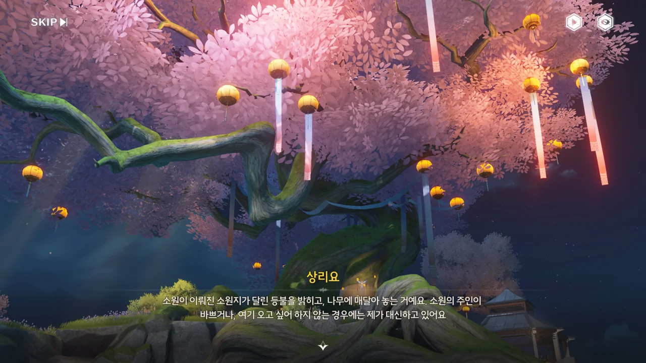 상리요가 소원이 이뤄진 소원지가 달린 등불을 밝혀 소원나무에 매달고 있다. 본래라면 소원을 빈 사람이 직접 해야 하는 일이지만, 바쁘거나 소원나무에 오고 싶어 하지 않는 사람들 대신 상리요가 등불을 매달고 있다고 한다.