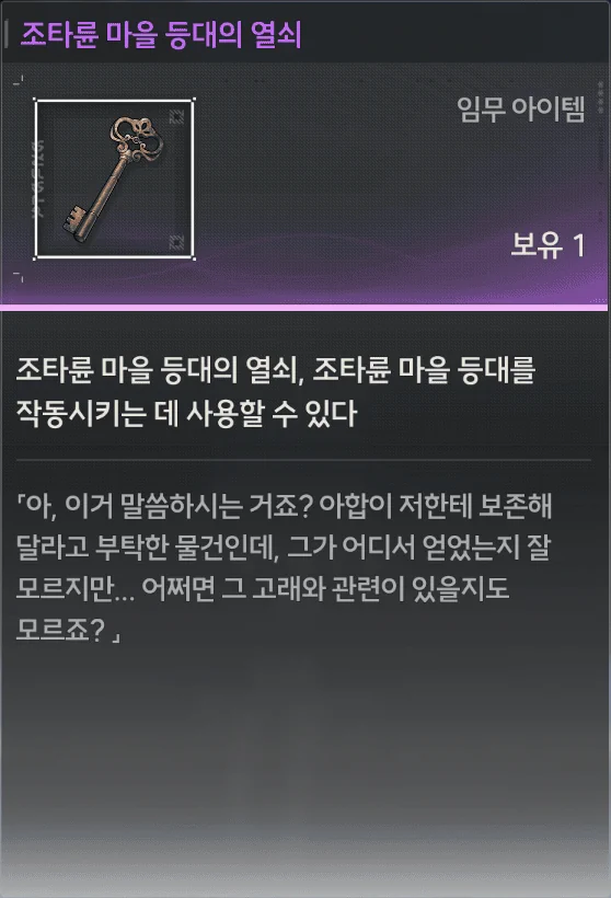 조타륜 마을 등대의 열쇠. 조타륜 마을 등대를 작동시키는 데 사용할 수 있다.