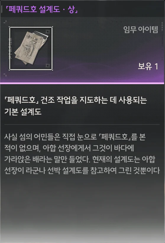 조타륜 마을의 등대를 밝히자, 페쿼드호 설계도를 얻을 수 있었다.