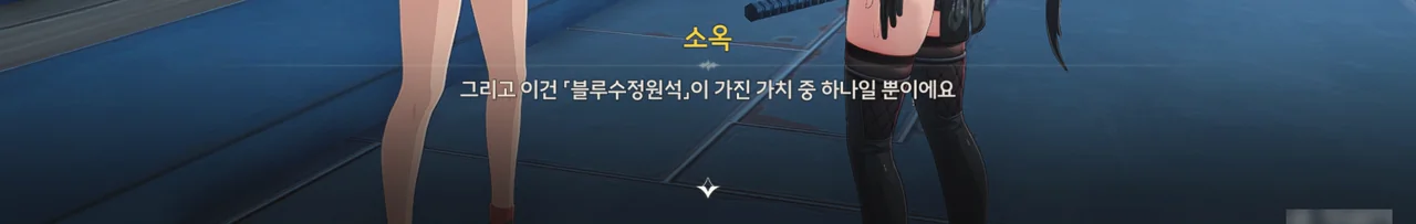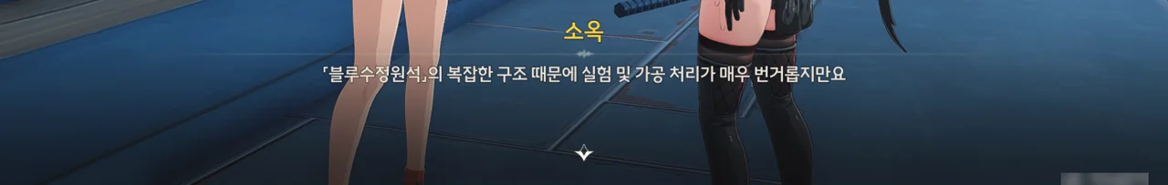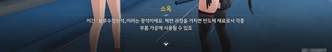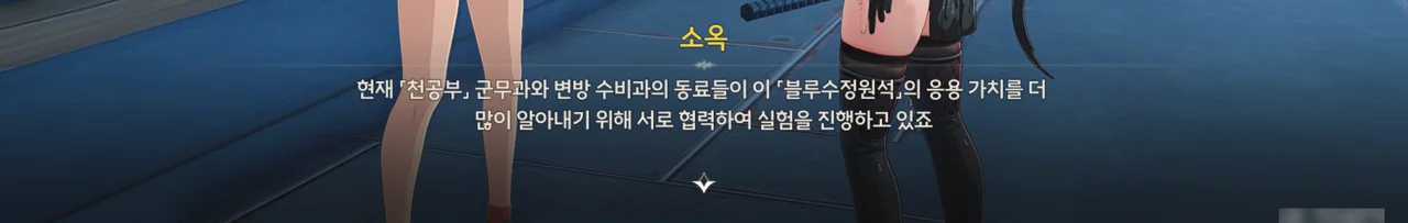 「블루수정원석」 — 쿠로게임즈 번역팀의 또 다른 찐빠로, 「반디석」이 올바른 번역이다 — 은 반도체의 원료가 되는 광물이다. 반디석의 또 다른 사용처를 알아보기 위해 현재 천공부 군무과와 변방 수비과가 서로 협력하여 반디석을 대상으로 한 실험을 진행 중이다.