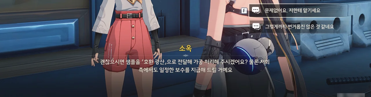 바로 오늘이 천공부에서 호환 광산에 샘플을 전달하기로 한 날인데, 하필이면 천공부에 임시 회의가 잡혀버려 호환 광산에 갈 사람이 없다고 한다. 그래서 소옥은 마침 만난 방랑자에게 샘플을 맡겨, 호환 광산에 대신 전달해 달라고 한다.