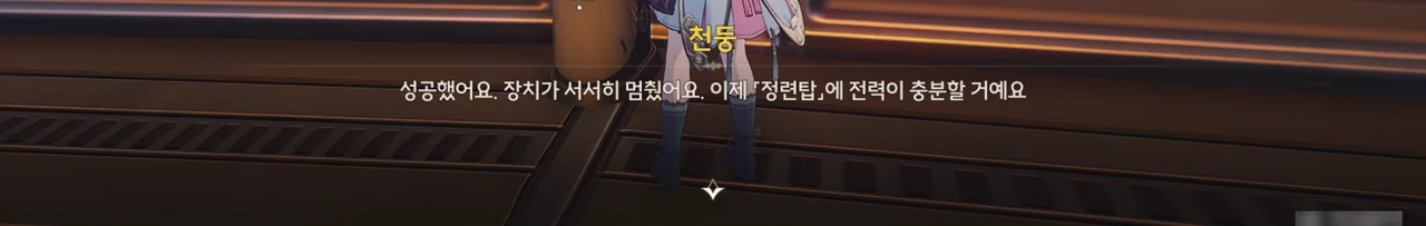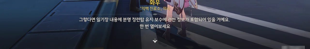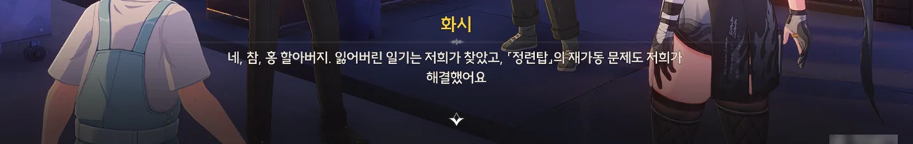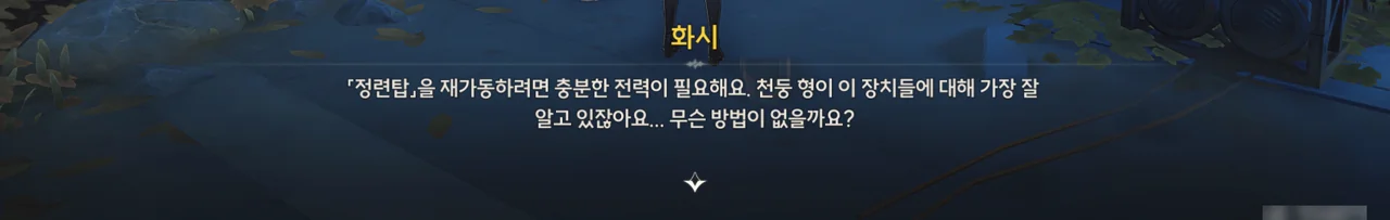 일지에는 정련탑을 재가동하기 위해선 충분한 전력이 공급되어야 한다고 적혀 있었다. 그 말을 들은 화시는 누굴 찾아야 할지 알겠다며, 방랑자를 안내한다.