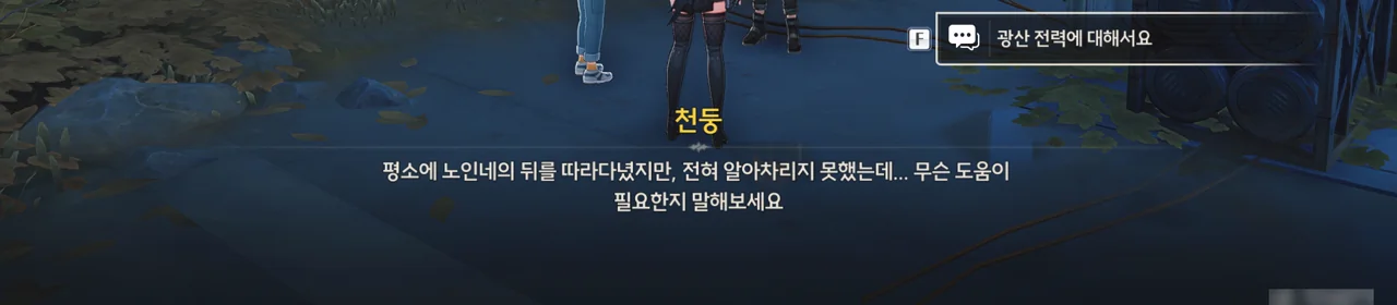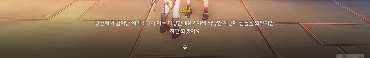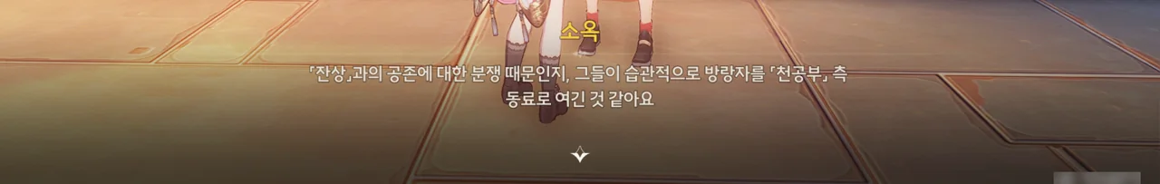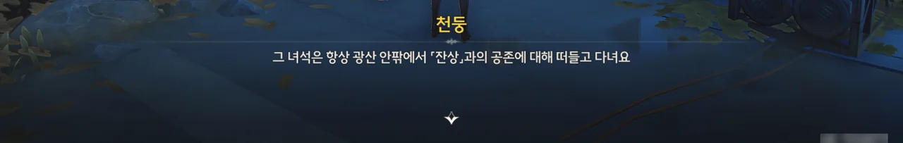 소옥이 말하길, 광산 사람들이 잔상과의 공존에 대해 서로 다투다가 습관적으로 방랑자를 천공부 사람으로 오해하고 무심결에 광산의 비밀까지 폭로한 것 같다고 한다. 비밀? 무슨 비밀?