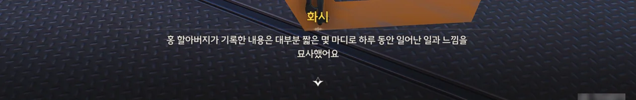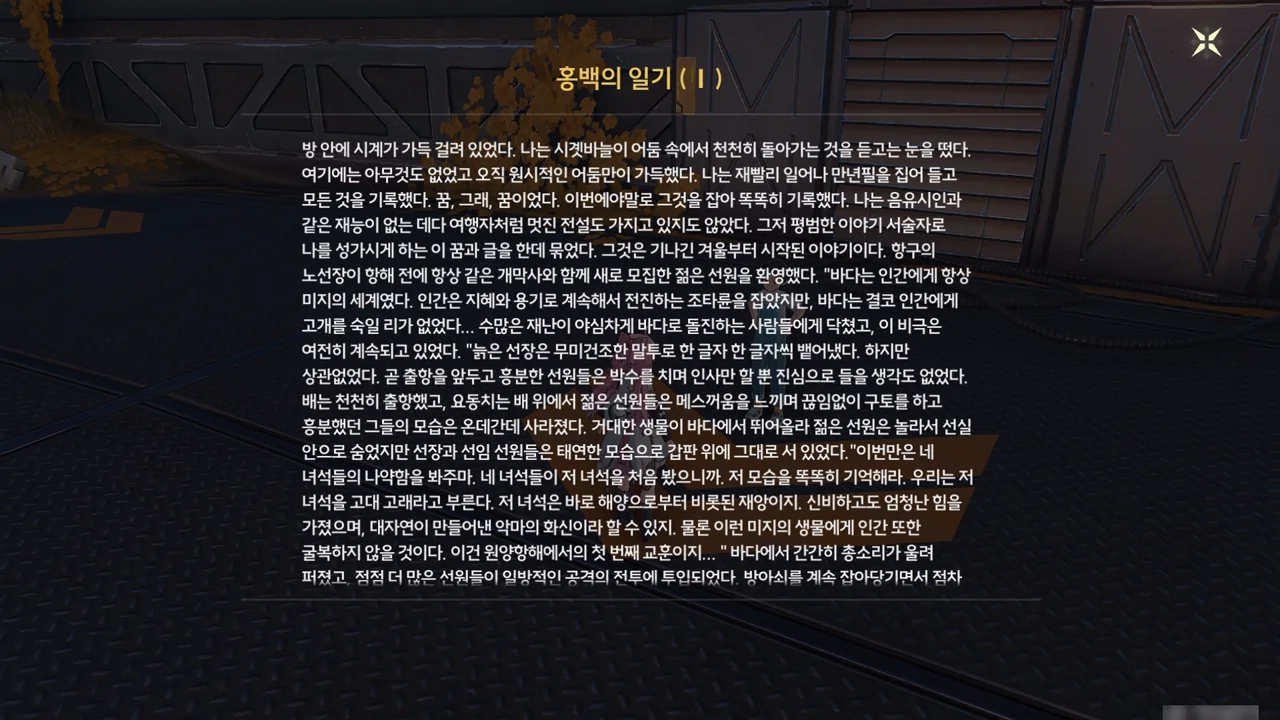 홍백이 정련탑 유지 보수 방법과 같은 중요한 내용을 일지에 적어놓았을 거라 생각해 일지를 뒤져보았다. 정련탑 유지 보수 방법을 찾은 건 좋은데, 홍백이 평소 점점 늙어가는 자신의 모습을 그리 좋아하지 않았다는 사실도 알게 되었다.
