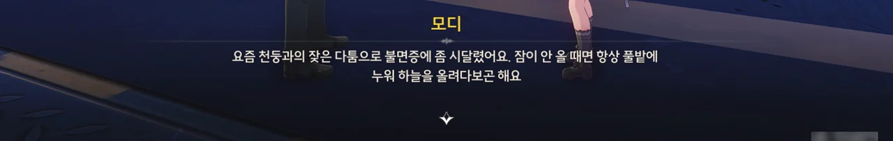 모디는 천둥과 다투는 것이 마음에 많이 걸렸는지, 최근 불면증으로 잠을 자지 못했다고 한다.