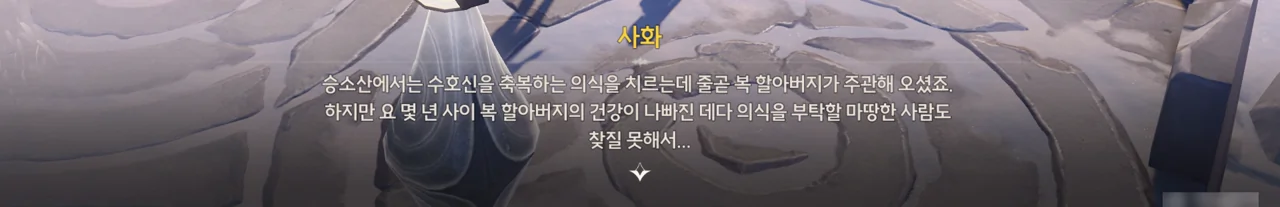 사화가 마을 밖에 있었던 건 상처가 악화된 수호신을 위해 최근 몇 년간 진행되지 않은, 수호신에게 축복을 전달하는 「수호신 의식 · 구슬 바치기」를 치르기 위해서였다.