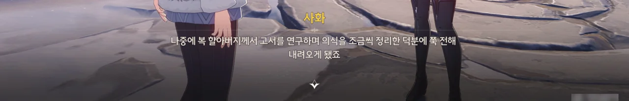 원래 이 의식은 복 할아버지가 주관했으나, 복 할아버지의 건강이 나빠진 데다 마땅히 의식을 대신 진행할 사람도 구하지 못해 요 몇 년간은 의식이 치러지지 않았다고 한다. 사화가 의식을 대신 진행하려 했으나, 의식의 과정이 너무 복잡한 데다 이에 대해 물어볼 복 할아버지의 건강이 더 악화된 탓에 시작하자마자 막다른 길에 부닥친 것이다.
