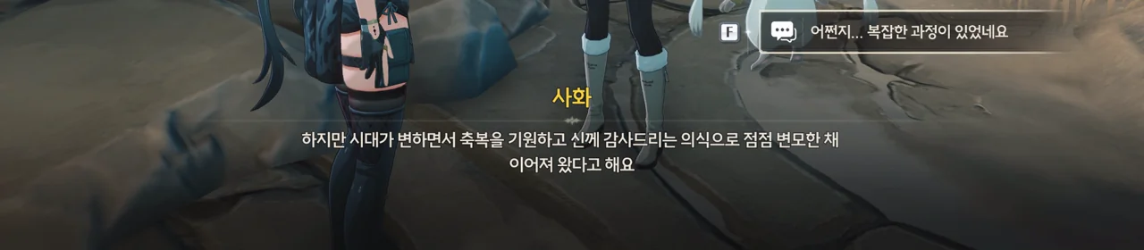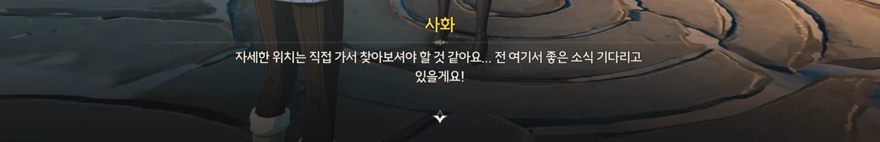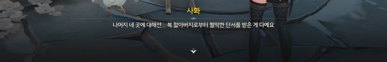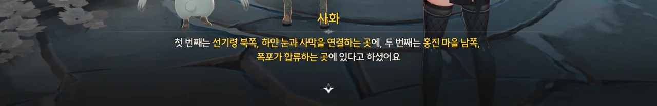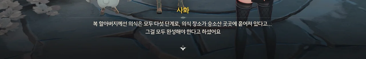 나머지 지역에 있는 네 곳의 의식 장소를 모두 방문해야 한다. 사화가 말해주는 장소가 어디인지는 전혀 모르겠지만, 퀘스트 마커가 잘 알려주겠지, 뭐!