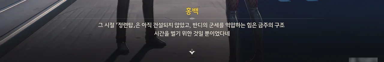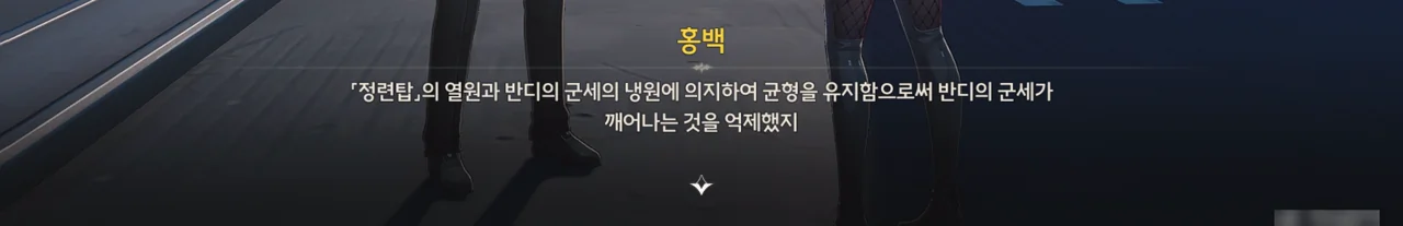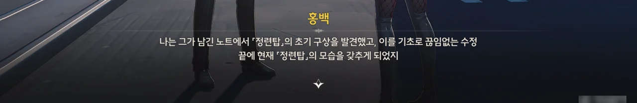 이후 홍백은 성문이 남긴 연구 자료를 진지하게 연구한 끝에, 잔상과 공생하기 위해선 양자택일이 아닌 절충을 해야 한다는 걸 깨닫고, 성문이 남긴 정련탑의 초기 구상을 다듬어 지금의 정련탑을 만들어내었다. 정련탑에는 광물을 정련하는 목적뿐만 아니라, 정련탑의 열기로 반디의 군세의 냉기를 일정량 억눌러 반디의 군세가 깨어나지 못하게 하는 목적도 있었던 것이다.