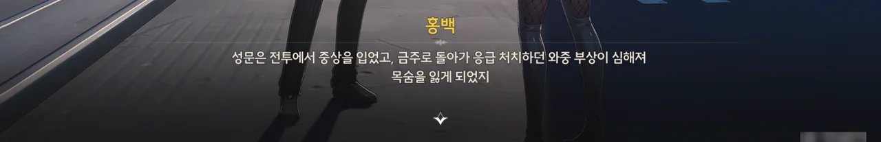반디의 군세와의 전투 중 큰 부상을 입은 성문은 금주에 실려가 치료를 받았지만, 결국 목숨을 잃었다. 홍백이라면 분명 광산을 재건할 수 있을 거라 믿었던 성문은, 광산이 동시에 두 명의 담당자를 잃는 걸 막기 위해 자신이 반디의 군세를 깨웠다며 천공부에 거짓말을 했고, 죽은 후에는 죄인 취급받아 기록말살형에 처해졌다. 문책을 받을 각오를 다졌던 홍백은 성문의 거짓말 때문에 성문이 받았어야 할 박수와 메달을 대신 받게 되었다.