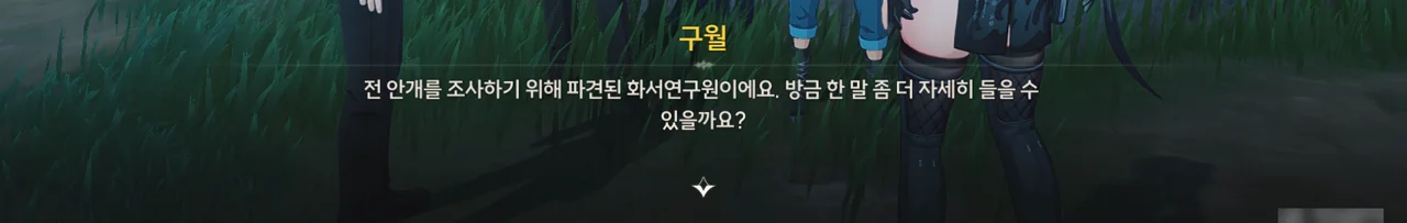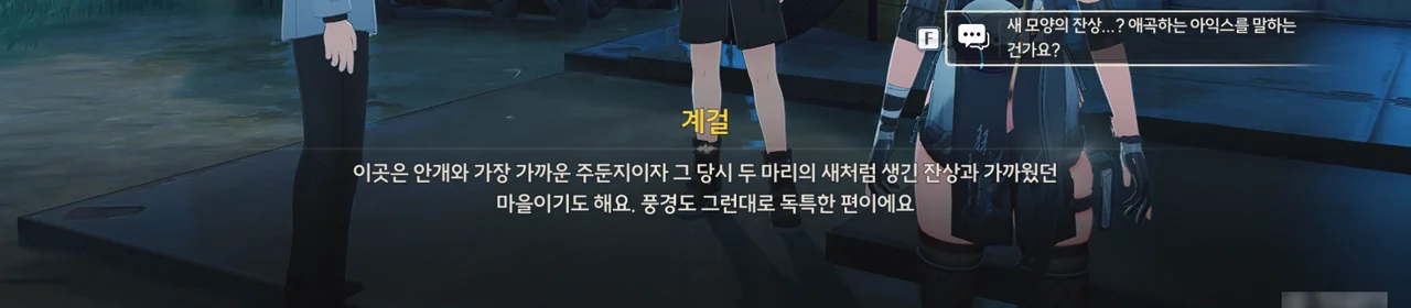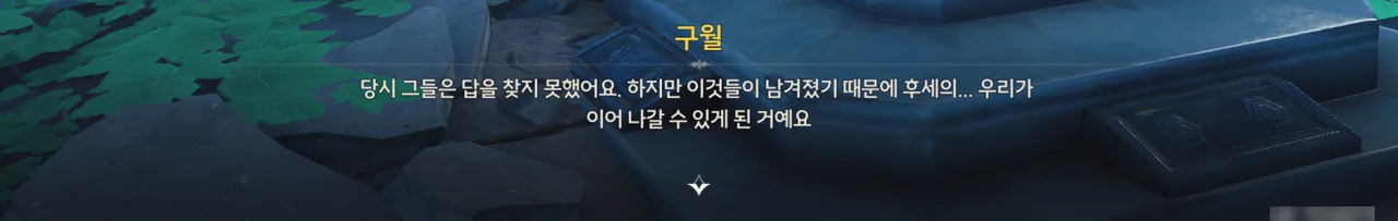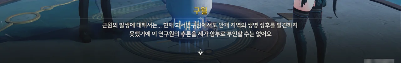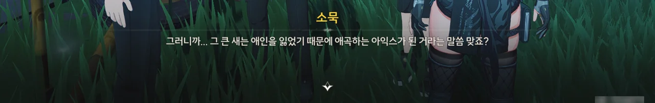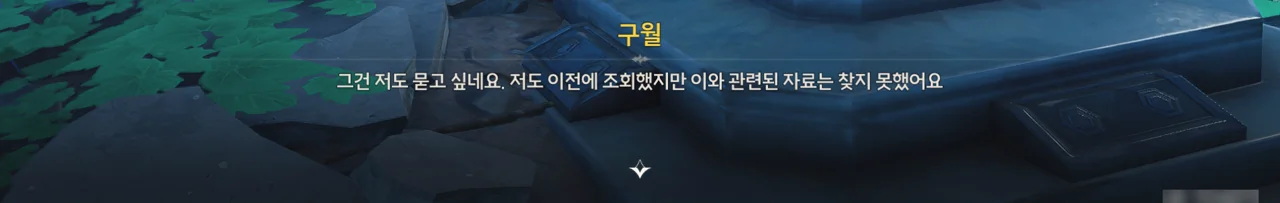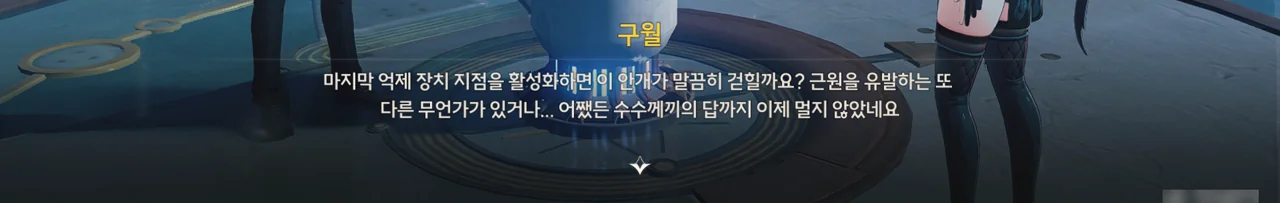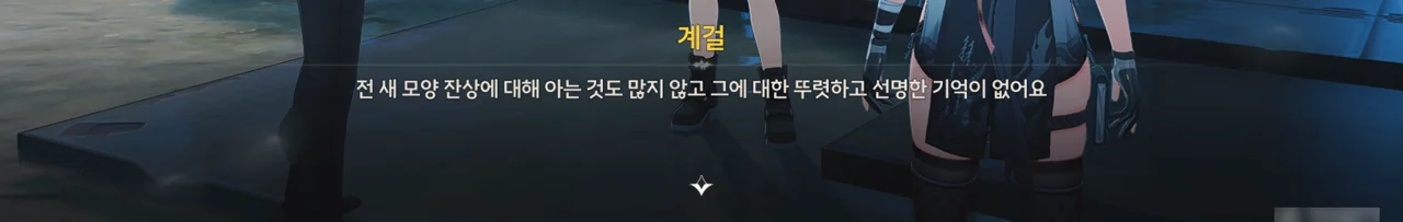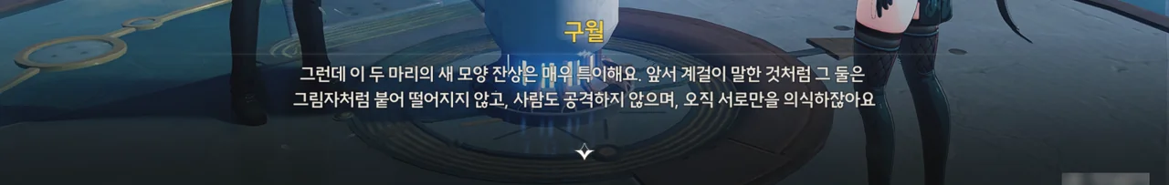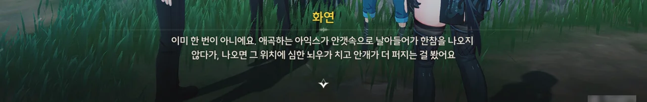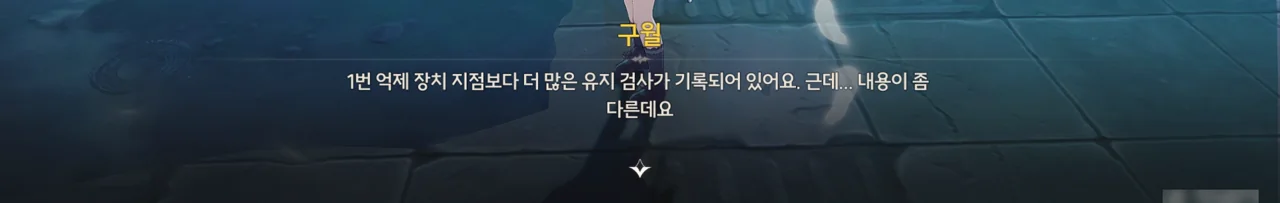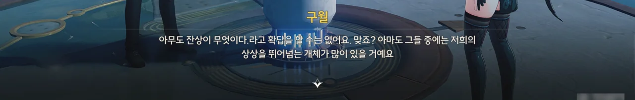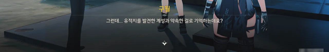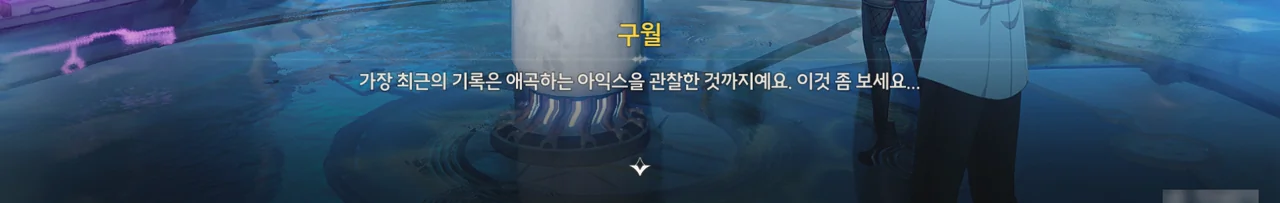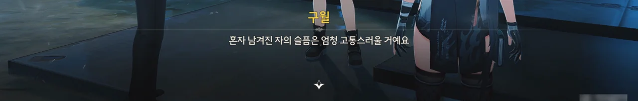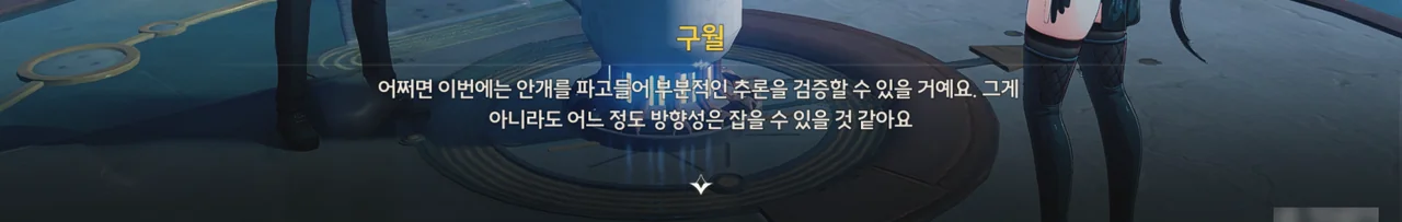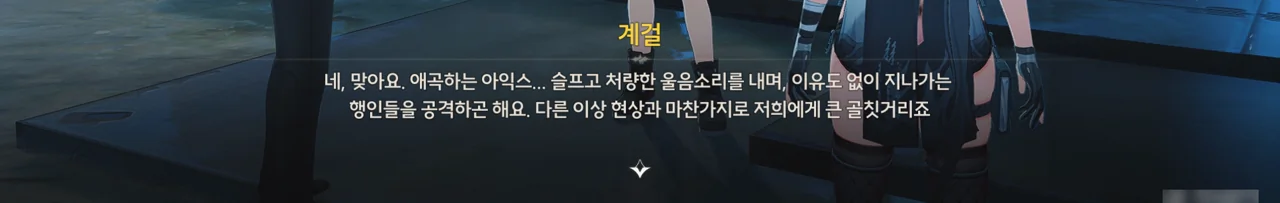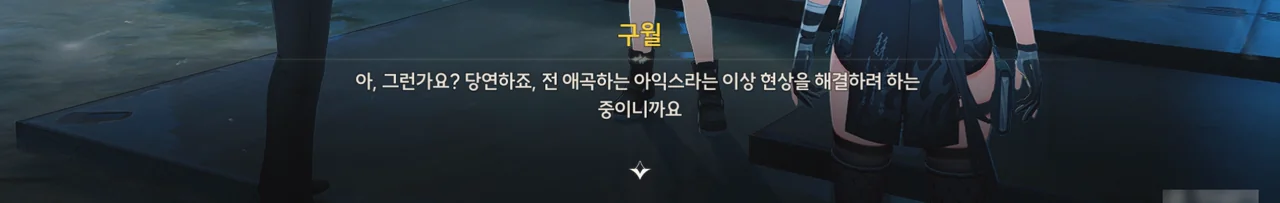 구월이 마치 애곡하는 아익스에게 공감하는 듯한 말을 하는데… 설마 구월도 비슷한 상실을 겪었던 건가? "애곡하는 아익스라는 이상 현상을 해결하려고 하니, 그에 대해 잘 아는 것이 당연하다"라고 말하지만, 애곡하는 아익스는 이상 현상이 아닌 잔상 아닌가? 잔상도 이상 현상 중 하나로 취급하는 건가? 구월이 뭔갈 숨기고 있는 것 같다는 생각이 든다.