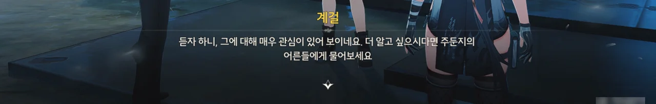 계걸이 애곡하는 아익스에 대해 더 자세히 알고 싶다면 주둔지의 다른 어른들에게 물어보라는 조언을 해준다.