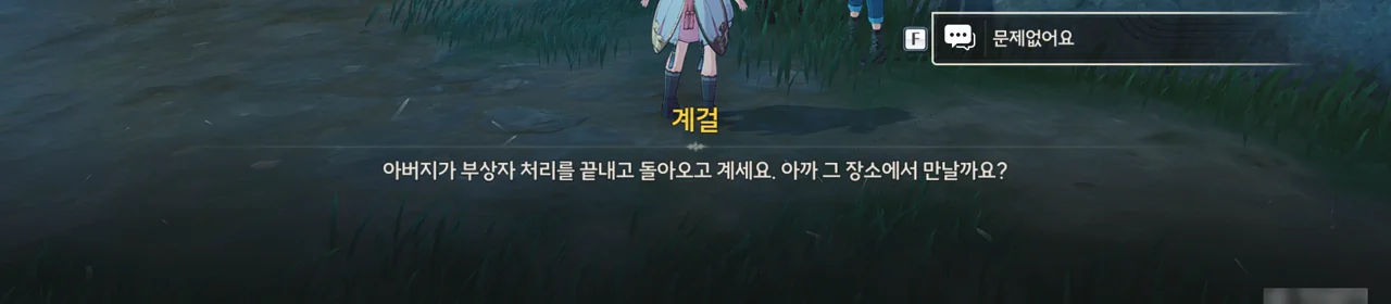 방랑자가 계성을 도와주면 일이 빨리 끝날 것 같아, 혹시 도울 일이 있냐 물었지만, 부상자 치료는 이미 다 끝났으며, 약속 시간도 맞추지 못한 주제에 도움까지 바라는 건 말도 안 된다며 부드럽게 거절당했다.