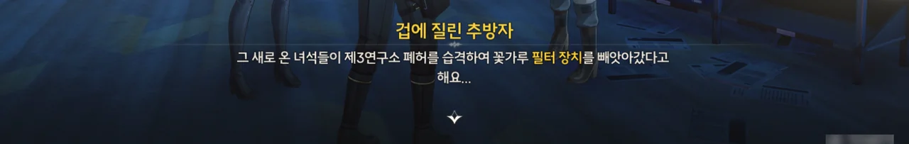 마지막 남은 창신 부품을 회수하기 위해 이동하려는 찰나, 망나니파 추방자 무리가 제3연구소 폐허를 습격해 꽃가루 필터 장치를 빼앗아갔다는 연락을 받았다.