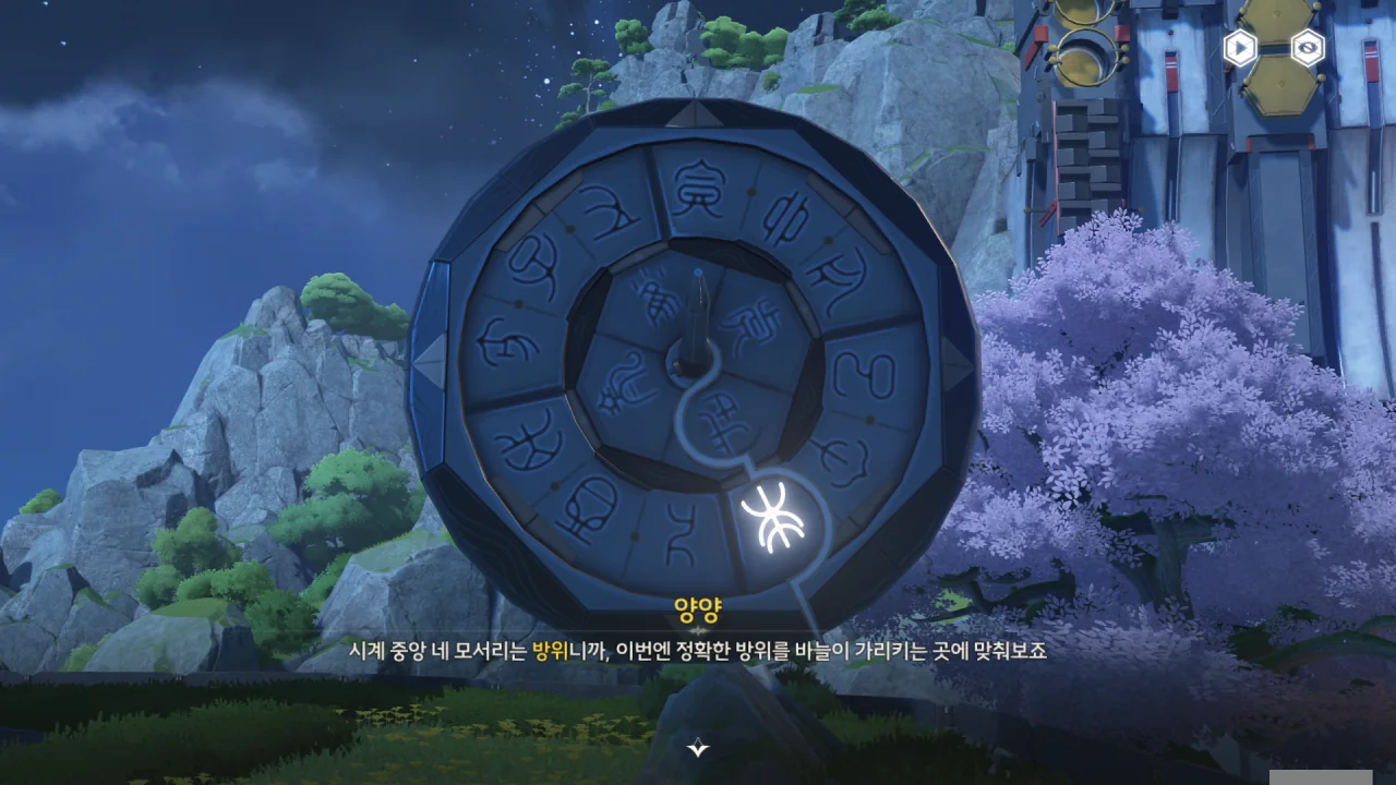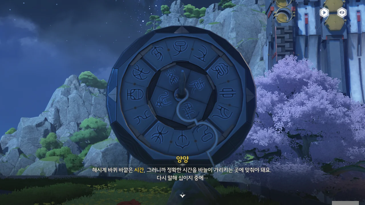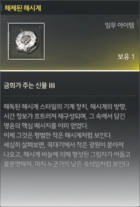 해독된 해시계 스타일의 기계 장치. 해시계의 방향, 시간 정보가 흐트러져 재구성되며, 그 속에 담긴 영윤의 핵심 메시지를 이미 얻었다. 이제 그곳은 평범한 작은 해시계처럼 보인다.