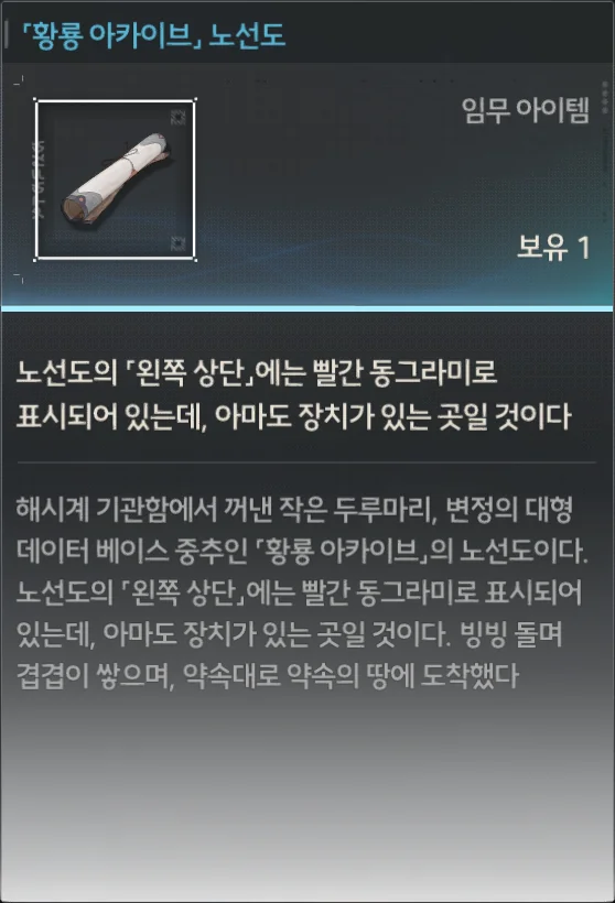해시계 기관함에서 꺼낸 작은 두루마리. 변정의 대형 데이터베이스 중추인 「황룡 아카이브」의 노선도이다. 노선도의 「왼쪽 상단」에는 빨간 동그라미로 표시되어 있는데, 아마도 장치가 있는 곳일 것이다.