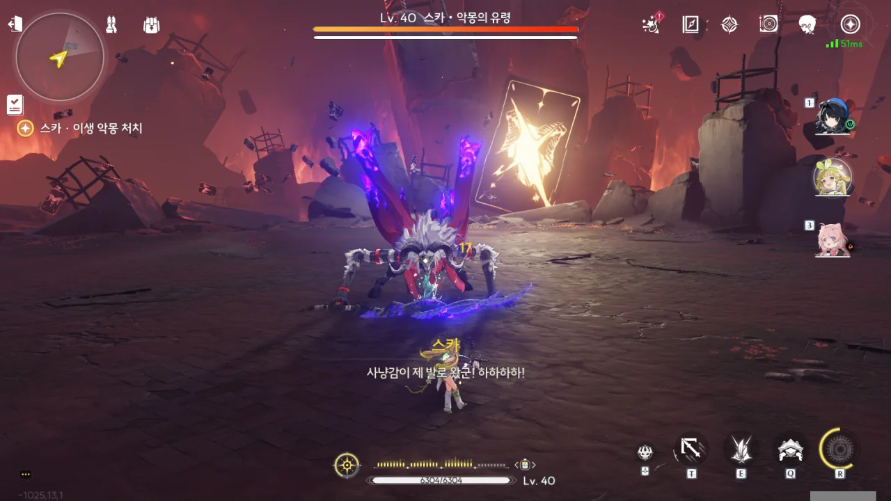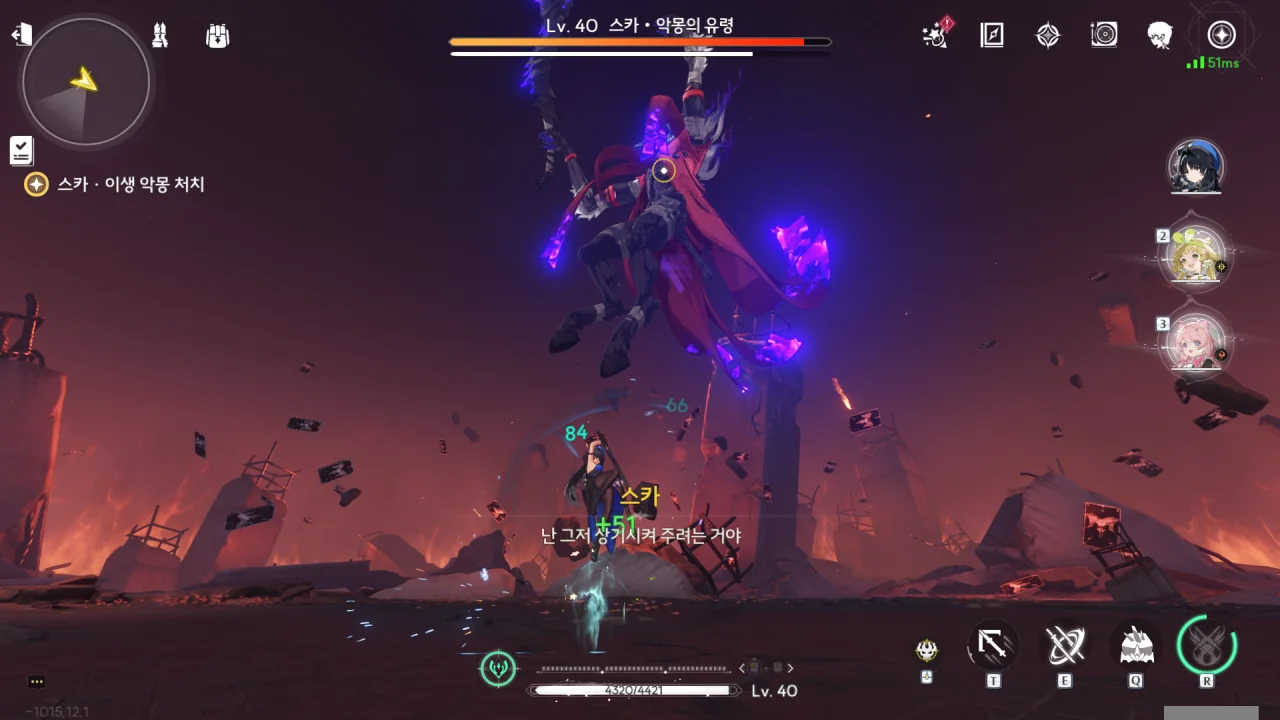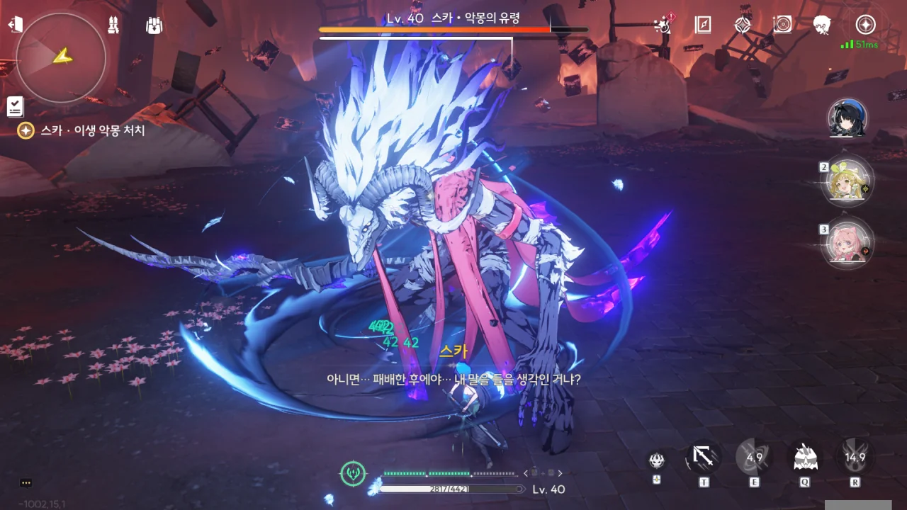 이전과 다르게, 스카가 빨간 카드를 던지며 공격해 온다. 별로 아프진 않다.